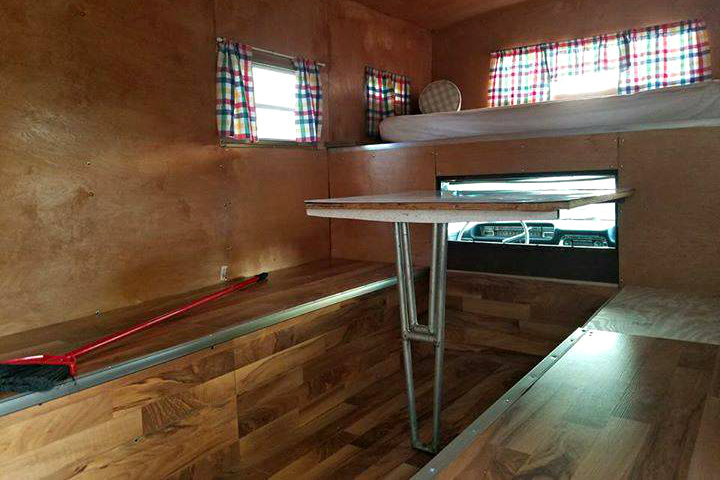 Within the camper section you will find a refurbished camping space. There is a bed up high, two benches down low, and a fold up table. I would guess that the bench areas could double as a sleeping areas as well. It would appear that the “fastback” section of the camper lifts up and is the entrance into the camper section. As far as the refurbishment, it looks like floors and benches were updated. There appears to be old luan plywood on the walls and some fresh plywood on the bench sections. Faux hardwood flooring has been added giving a slightly classier appearance. Quite simple, there is potential to update this camper and make it more user friendly in this modern day and age. An interior view of the back section of the camper would have been nice to get a better grasp of the layout and features wrapped up in this classic. There are a few service doors and possible storage areas on the driver side exterior of the camper, but it isn’t quite clear what features this camper may have.