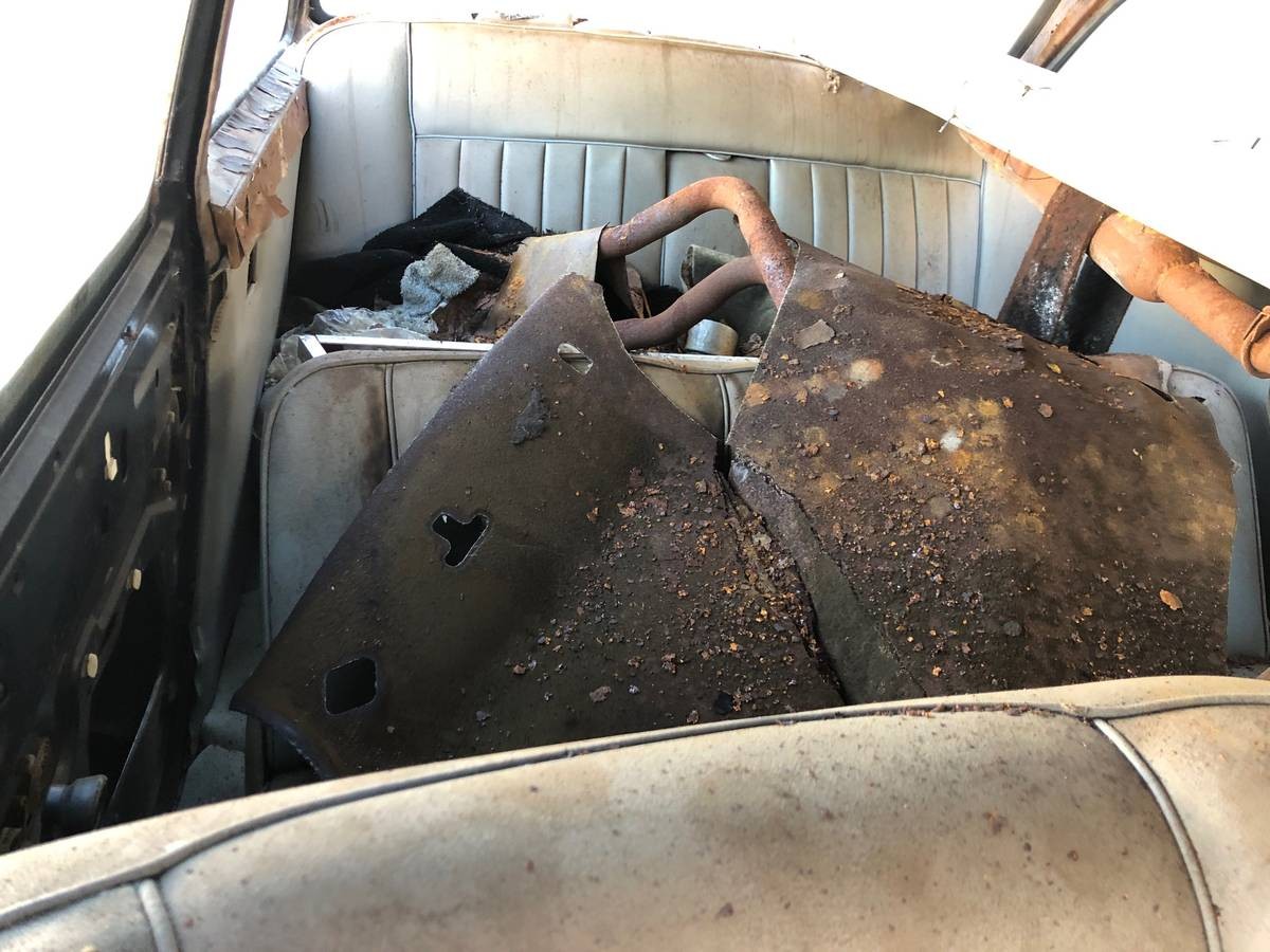 While a total project bordering on basketcase, there’s more here to work with than you might expect. There’s a largely complete interior, although the instrument binnacle is missing. The majority of the glass appears to be in place. The full-length exhaust appears to be hiding inside the car. And while the roof is heavily dented, it doesn’t look totally rusty, although I’m sure there is rust to be found.