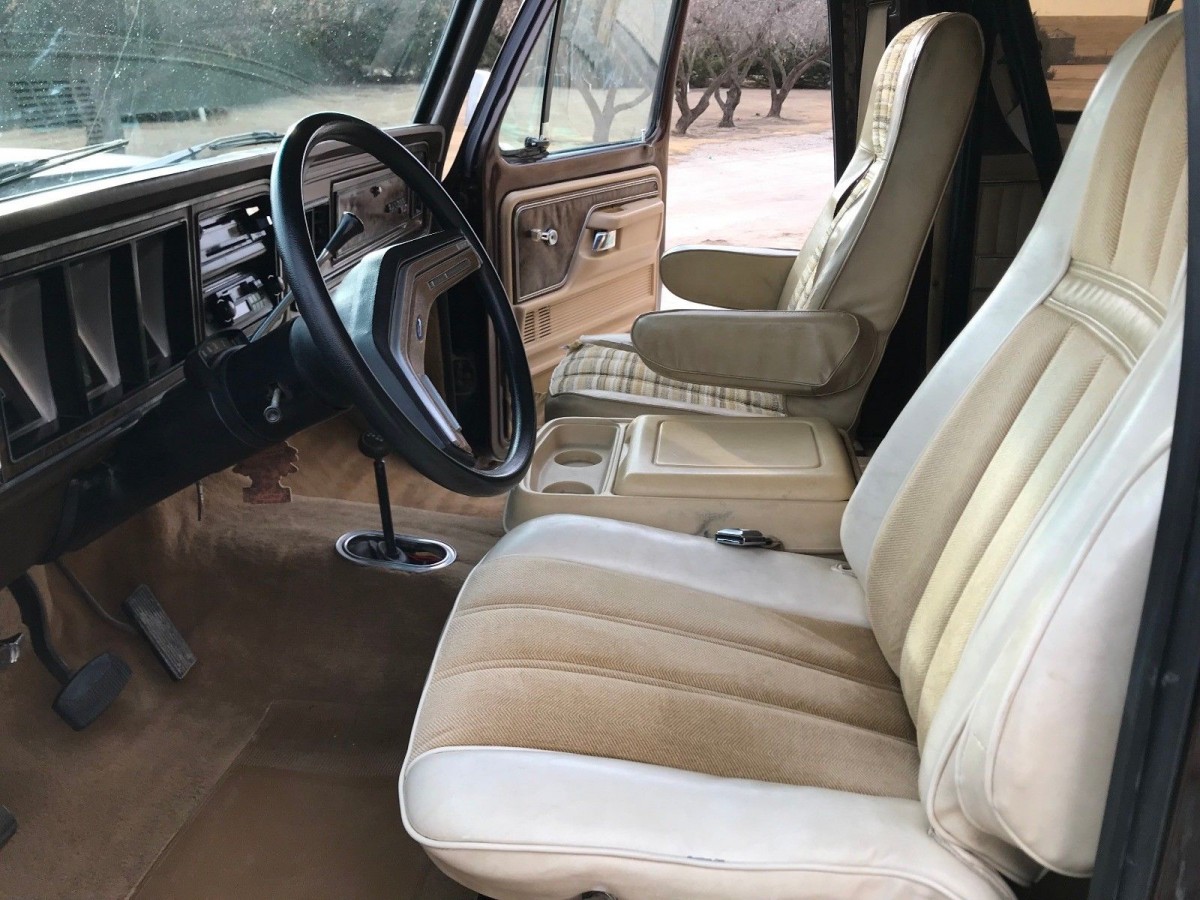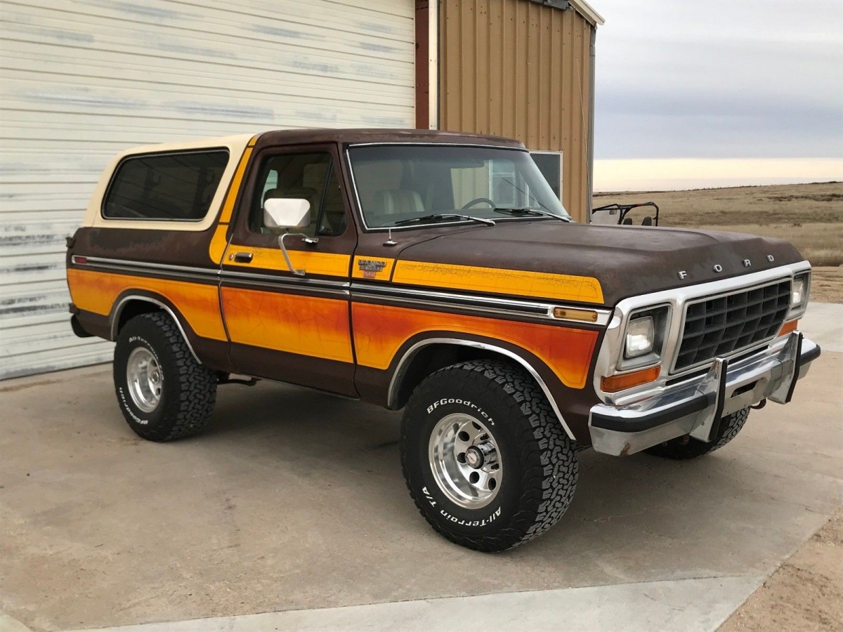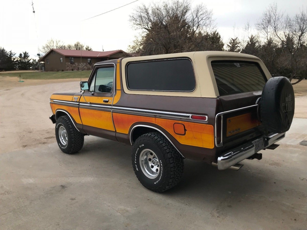 I had a 1979 long bed f150 4×4 that was black with the sun stripes just like the bronco in your picture mine had a 400 with an automatic and black interior. Loved that truck it was fun to drive