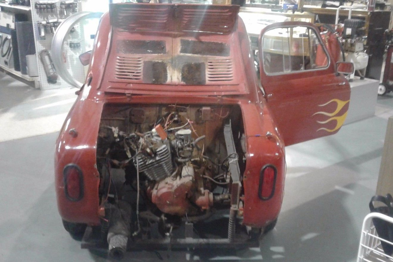 This Vespa appears to earn its flames with something a bit more modern in its tail. The seller gives no information about the engine—or much of anything else, really, beyond the car’s rarity—but there appears to be a Honda badge stamped into the red housing there. The listing refers to the car as a “Vespa 400 G80,” so my best guess is that this is a 1979-vintage one-cylinder, four-stroke Honda G80 engine. Logical, right?