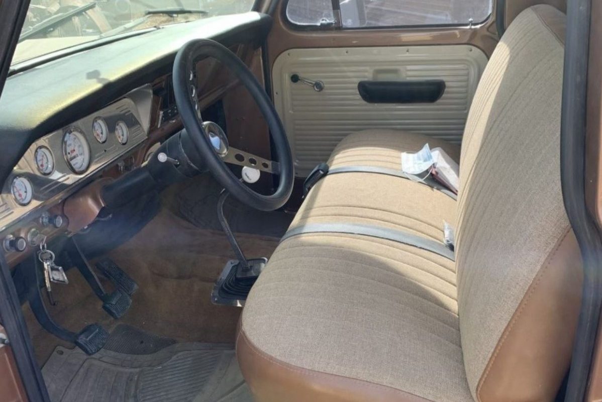 The F100 is finished in a unique combination of bronze and white, and its presentation is excellent. The paint shines beautifully while the panels are straight. There is one small dent near the radio antenna, but this barely shows in the photos. The only other body defect to note is a small hole on the right inner fender, which the owner believes might be the result of a battery acid spill at some point. Looking closely at this Ford, you start to notice a few understated custom touches beyond the distinctive paint finish. The grille is a custom tubular item that gives the front a clean and crisp look. The rear pan has been rolled, and the owner has fitted a custom fuel tank into the bed. The bed itself looks spotlessly clean, as does the trim. The glass is free from flaws, while the pickup rolls on a set of 15″ alloy wheels that the owner has just fitted with new tires.