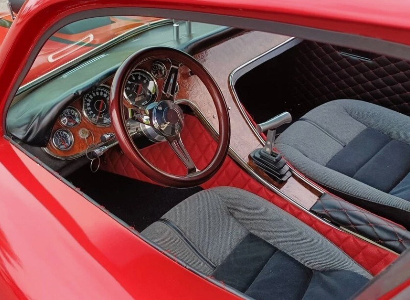 Kellison used Studebaker windshields; this one is surrounded by custom trim. The door locks are electronic. The seller insulated the entire cabin against heat and noise, and installed new carpets, a custom steering wheel, a wood-trimmed instrument panel, programmable gauges, and bucket seats. The carpet and headliner are new. The car comes with side windows, but they are not installed.