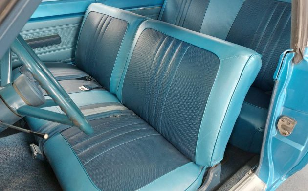 This car just got out of the body shop, as the B5 blue paint is only a month old. Rust apparently wasn’t an issue, as we’re told the floors and trunk are “perfect.” The interior looks completely stock, and we’re guessing the upholstery has been redone since the mileage is about to turn over. Bench seat muscle car with a column-shifted tranny! The car’s power steering and brakes were factory-installed.