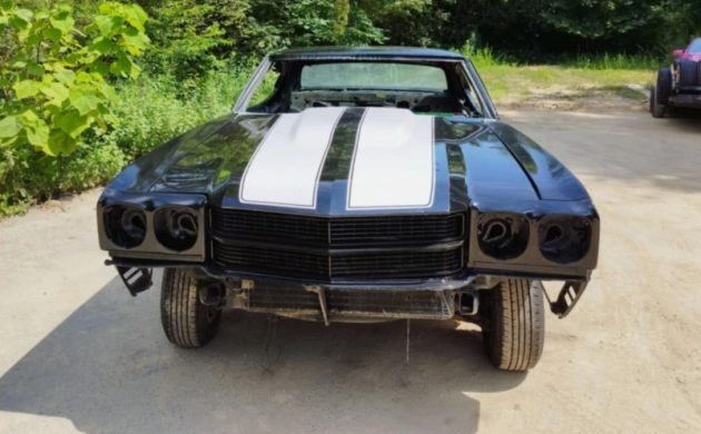 As a dealer is involved in the sale of this Chevy, not much in the way of history is provided. While we know the transmission is a TH-400 automatic, we don’t know if this Chevelle was an SS 396, SS 454, or something else. The stripes and badging suggest an SS, but they’re easy to come by. What you see is what you get, so the front clip is incomplete, and there is no interior except the shell of a dashboard. All the glass is there, but no windshield.