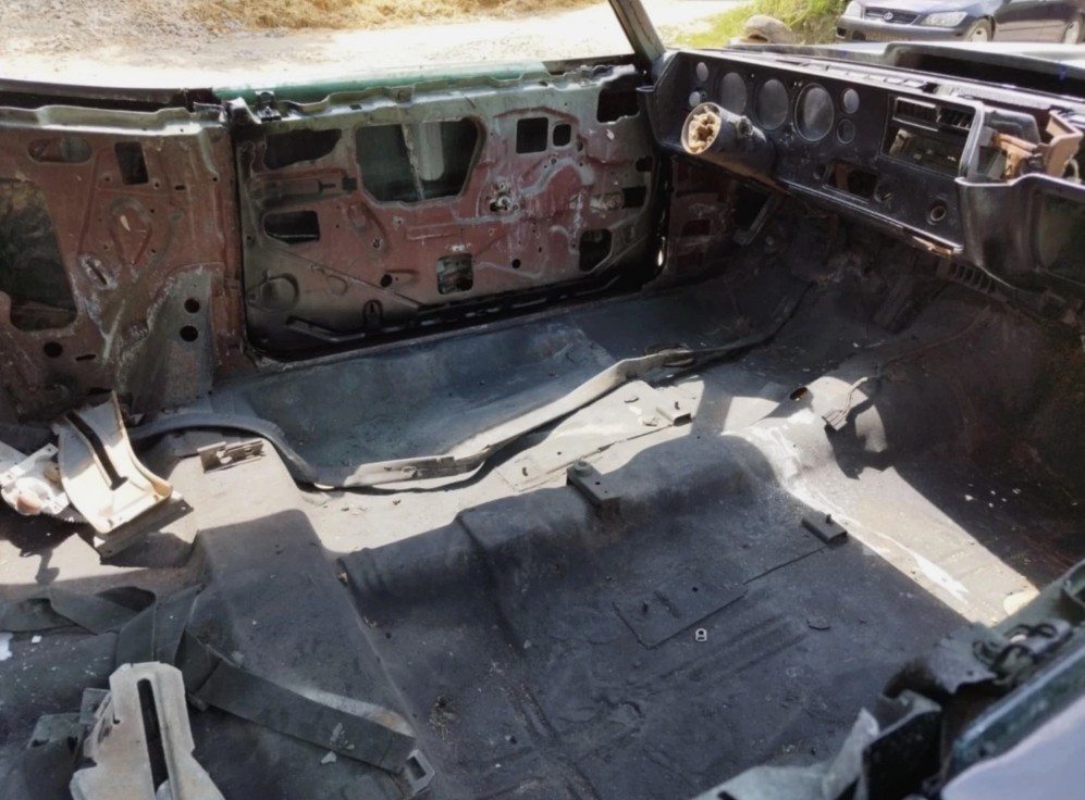 As a dealer is involved in the sale of this Chevy, not much in the way of history is provided. While we know the transmission is a TH-400 automatic, we don’t know if this Chevelle was an SS 396, SS 454, or something else. The stripes and badging suggest an SS, but they’re easy to come by. What you see is what you get, so the front clip is incomplete, and there is no interior except the shell of a dashboard. All the glass is there, but no windshield.