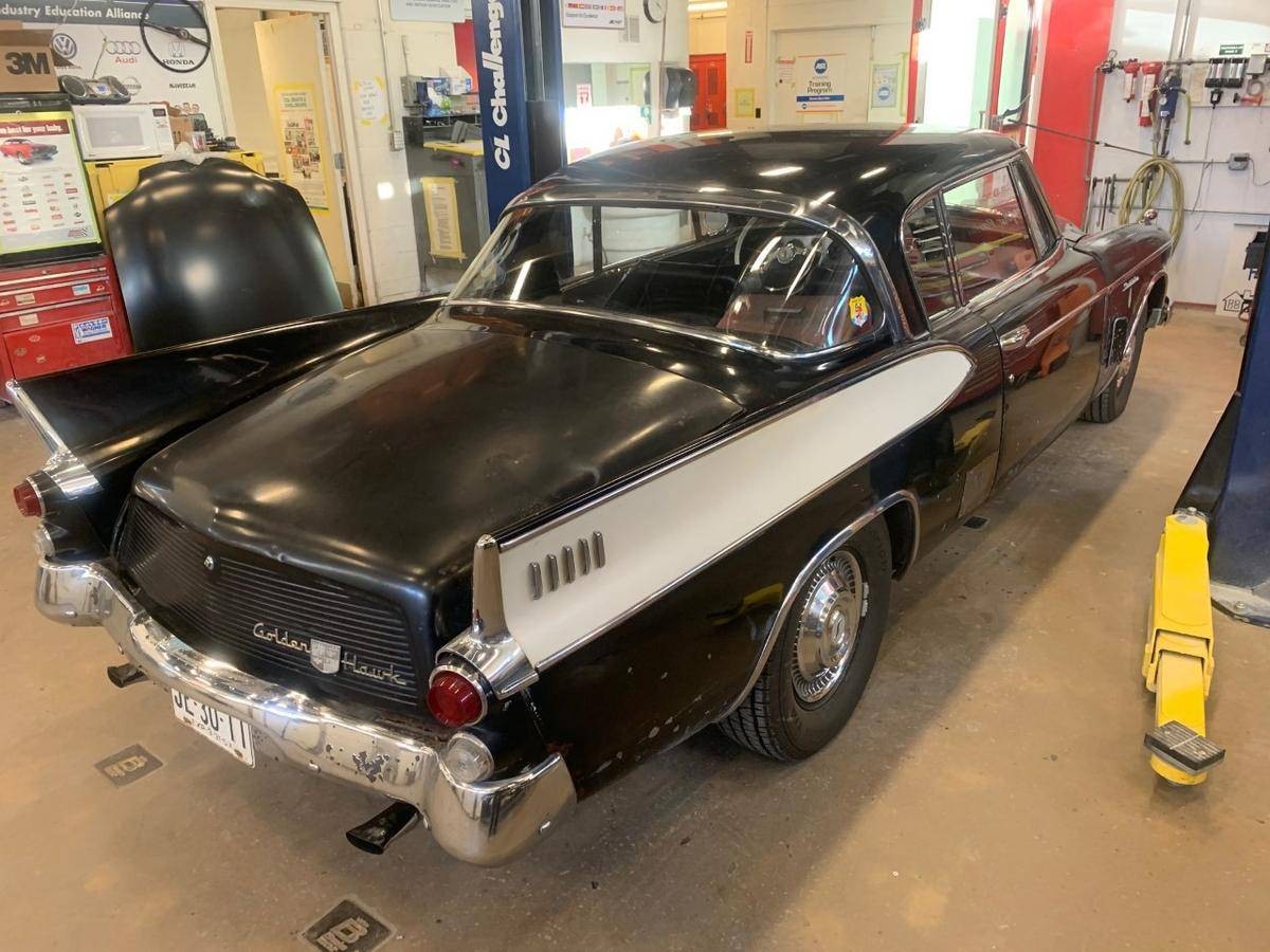 Always liked the Hawk. My first car was a ’61 Hawk hand me down from my parents in ’65. My older brother also had a ’61 Hawk at the same time, his was white with red interior, mine was white with black interior. He later had a ’63 GT Hawk white with red interior and a 4 speed. By the time I was a senior in high school, I traded the ’61 for a ’64 Avanti R 1 and my brother was stylin’ with a ’66 Vette coupe with 427 and a 4 speed. Was back in my home town yesterday for a funeral and saw a ’57 or ’58 Golden Hawk in a driveway near my sister’s house. It was white with a gold fin stripe and was a driver needing some love. I could never tell the difference between the ’57 and ’58 Golden Hawk, is there any?