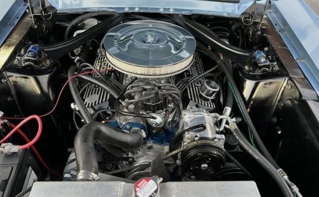 The seller emphasizes that every aspect of this Mustang is new or restored. Therefore, it appears that the refurbishment included a partial retrim in two-tone Blue Deluxe vinyl. The carpet beneath the driver’s feet looks slightly dirty, the only visible flaw worth noting. The dash and bright trim are comfortably acceptable for a driver-grade classic, and hitting the road with the top down won’t embarrass the new owner. Those seeking creature comforts will welcome the ice-cold air conditioning and the retro-style stereo with kickpanel-mounted speakers.