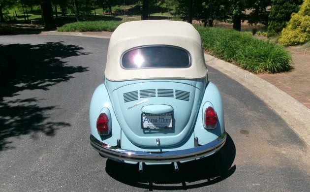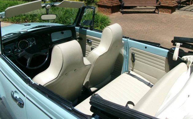 The Super Beetle Convertible was at the top of the price list at about $2,600 and here’s one that’s fresh off a recent restoration. Six colors were offered for the Super Beetle in 1972 and this one is showing off a pleasant shade of Marina Blue. The seller claims everything is in new or like new condition and has only been driven 17.8 miles since the nut a bolt frame-off restoration completed by Elite Customs in Spartanburg, South Carolina. Everything sparkles and shines and the new beige/off-white manual convertible top is a tasteful compliment to the Bug’s baby blue finish. One thing I noticed is that the spare tire has the standard silver-colored slotted wheels, but those aren’t present on the front and rear blackwall tires.