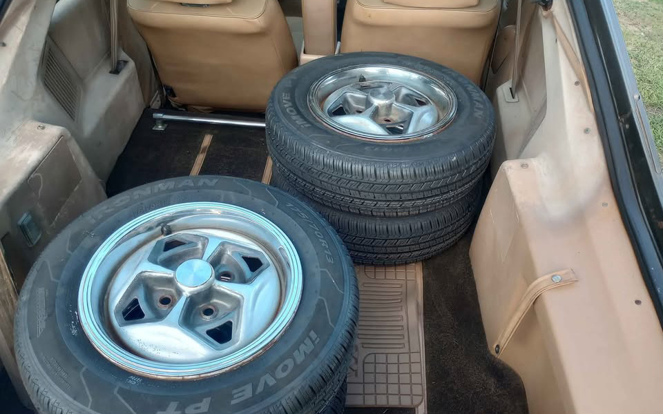 This was it for body styles: a two-door hatchback. I’ve always wondered what a convertible might have looked like… In case you were wondering as much as I was, yes, the original wheels and tires come with the car; they’re in the rear cargo compartment. That’s a huge relief; they would go back on in the first half-hour under my ownership. The seller says this is a solid car and not rusty, but there’s clearly some bubbling rust showing at the corner of the left taillight, and around the rear wheel arches, so I’m not sure what they mean by not rusty. Maybe not to the extent that it would be if it had been in the Upper Midwest for the last 43 years?