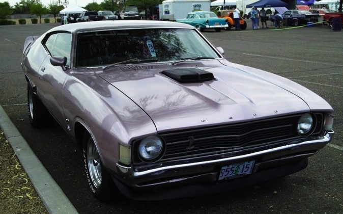 This car appears to be assembled from some Mustang and aftermarket parts. It appears to be a Falcon 500. The 302 engines were listed as Australian built “Cleveland” engines. Research indicates none were built with rear spoilers, or “Shaker” hoods. The Falcon GT coupes, and sedans did have hoods with two “NACA” ducts. There were no “Cobra” models built by the factory.