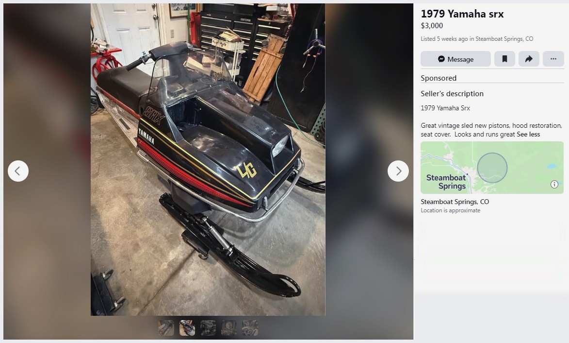 From its stock race heritage to being a liquid-cooled trail and frozen lake runner, Yamaha’s SRX was a beast on the oval track or on the trail. This 1979 Yamaha SRX 440C is listed on Facebook Marketplace in Steamboat Springs, Colorado, a place that knows a thing or two about snow, and the seller is asking $3,000. Here is the original listing, and thanks to the original snow king, Howard A, for the tip!