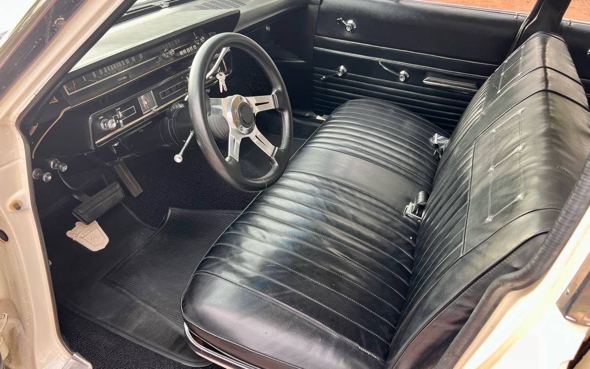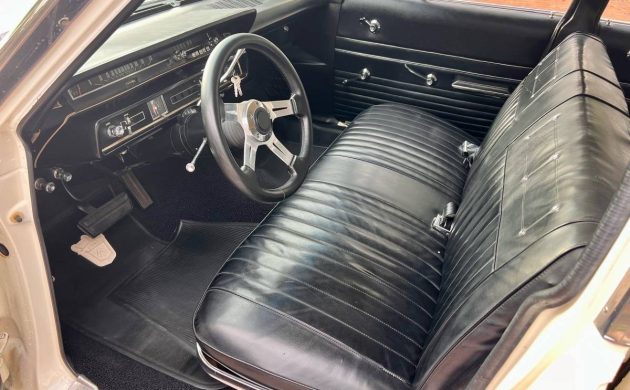 The interior is nearly immaculate, with a clean vinyl front bench, nice door panels, original (or reproduction) factory floor mats with the Ford logo, and an unfortunate aftermarket steering wheel. It has an automatic transmission, which would be a three-speed unit for 1965.