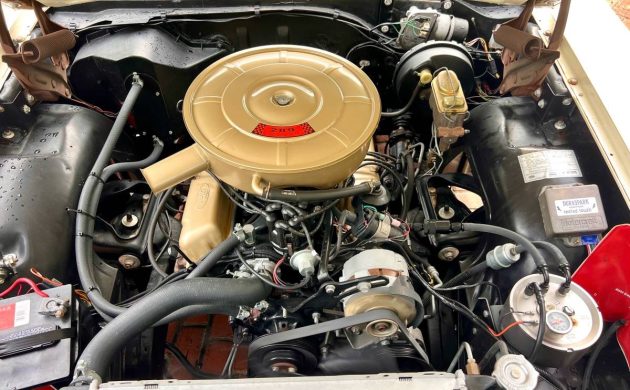 Ford station wagons were available with a full array of powerplants in addition to the 289, including the FE-based 352 and 390. The seller doesn’t disclose whether this is the six-passenger or the ten-passenger wagon, but I imagine the little 200-horsepower 289 would have struggled with a ten-passenger load. You can see, however, that all is not stock under the hood; the seller claims that you’re looking at a “rebuilt high performance 289 with upgraded fuel injection for ease of driving and dependability.” What’s been done is left up to the imagination, so let’s do a visual inspection. It has later valve covers painted in the correct gold, a later power steering pump (from an ’80s 5.0 by the looks of it), a Duraspark ignition box, a dual-circuit master cylinder, and a canister up front that seems to have something to do with the fuel injection system. Based on the nuts and washers, I’d say that the front suspension has been rebuilt, too.