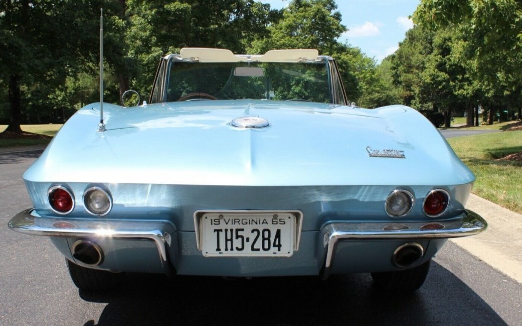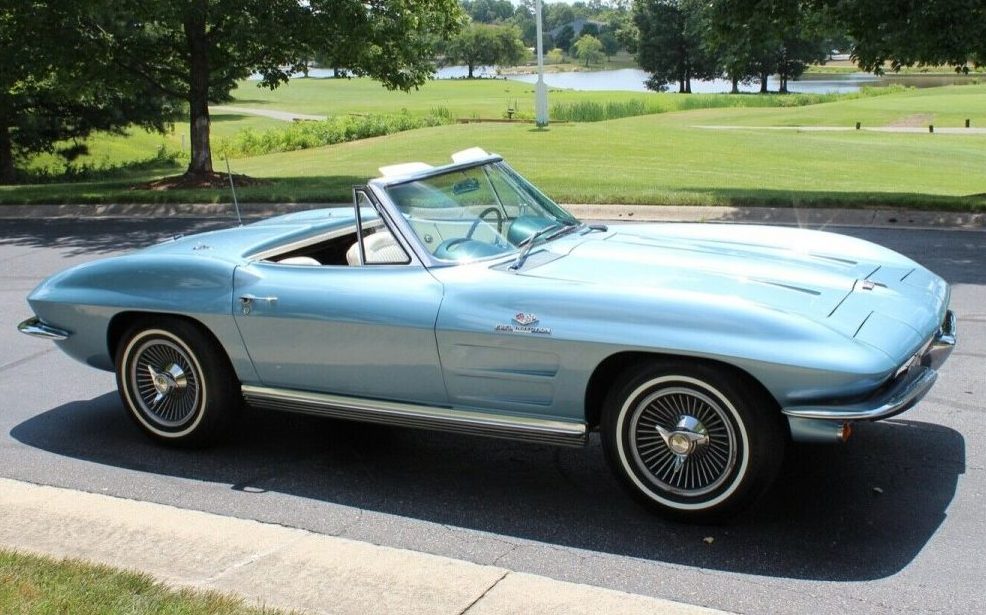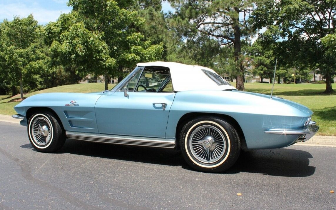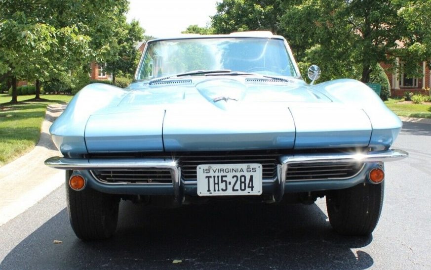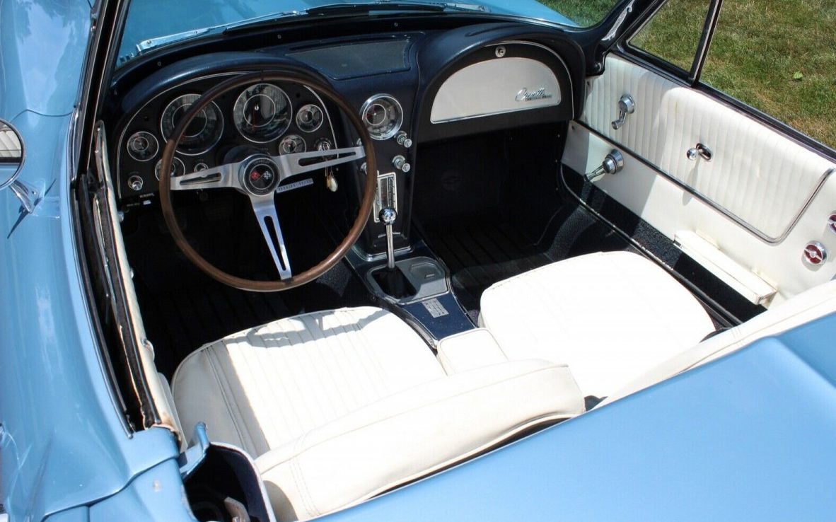 The exterior’s Silver Blue finish, one of seven available for ’64, appears unmarred though there is a mention of some faded paint. The body panels and bonding strips, however, show no evidence of cracking or separation. The seller adds, “Frame is rock solid and only exhibits surface discoloration typical of age“. The knock-off wheels are listed as reproductions but they look fine enveloped by their white stripe tires, and I thought that I would never admire “whites” on a Corvette but they’re true to form for ’64. Finally, this Corvette does come with a removable hardtop, a welcomed addition for any convertible Corvette.