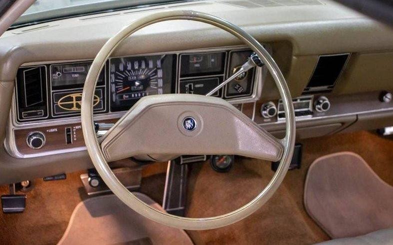 Inside, one discovers a splendid-looking Sandlewood interior which is stated, “shows well and is clean with nice carpet and a good headliner“. Unfortunately, a comprehensive image of the entire shebang is not included, but what can be seen does look A-OK. And an interior is this light a shade is a tough one to keep looking clean. Of note is the goofy-looking Riviera emblem stuck to the left side of the instrument panel, not sure what its purpose is, it’s not like one would need to be reminded what they’re driving.