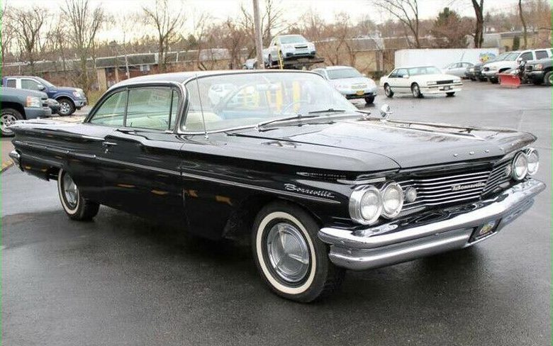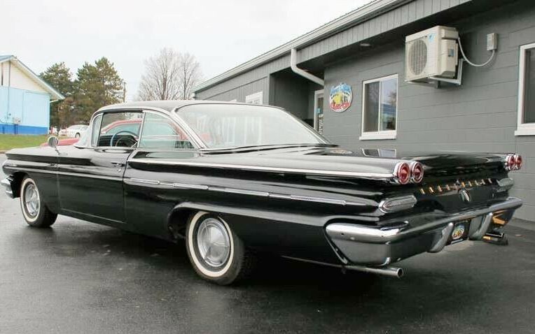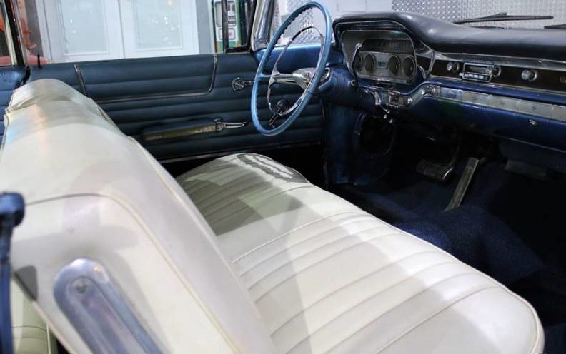 I absolutely love this body style of the Pontiac Bonneville. 1960 was a great year and Pontiac promoted the “Wide Track” campaign as stated. There is a picture somewhere of one on a high banked curve. It looks like it is getting ready to take off. These pillarless hardtops almost look like they are a convertible. I love the black exterior of this one with the white parchment. However, I am not a fan of the blue kick panels and dash. If it were black, I might have to pull my 401k and sell my 69 Coronet 440. Super cool nevertheless.