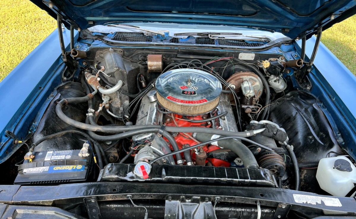 We’re told that this ’69 SS is numbers matching and has the less ferocious version of the 427 (the only one you could get with factory air conditioning, which this seeming survivor has). The motor is paired with a TH-400 automatic transmission and a 12-bolt rear end (lots of torque). We’re told the machine “runs and drives ok” from sitting, so perhaps some tinkering is needed though the carburetor, alternator, and voltage regular are all new. The odometer reading is 44,000 miles, though no claim is made as to whether that is accurate.