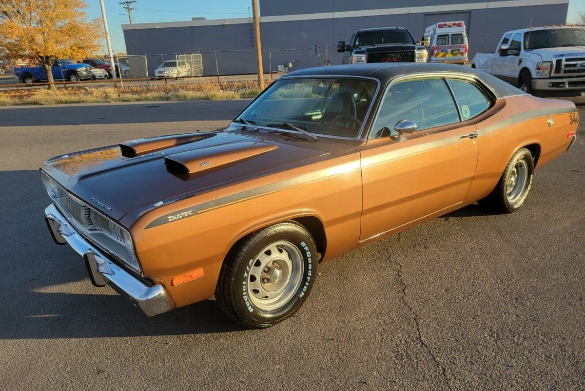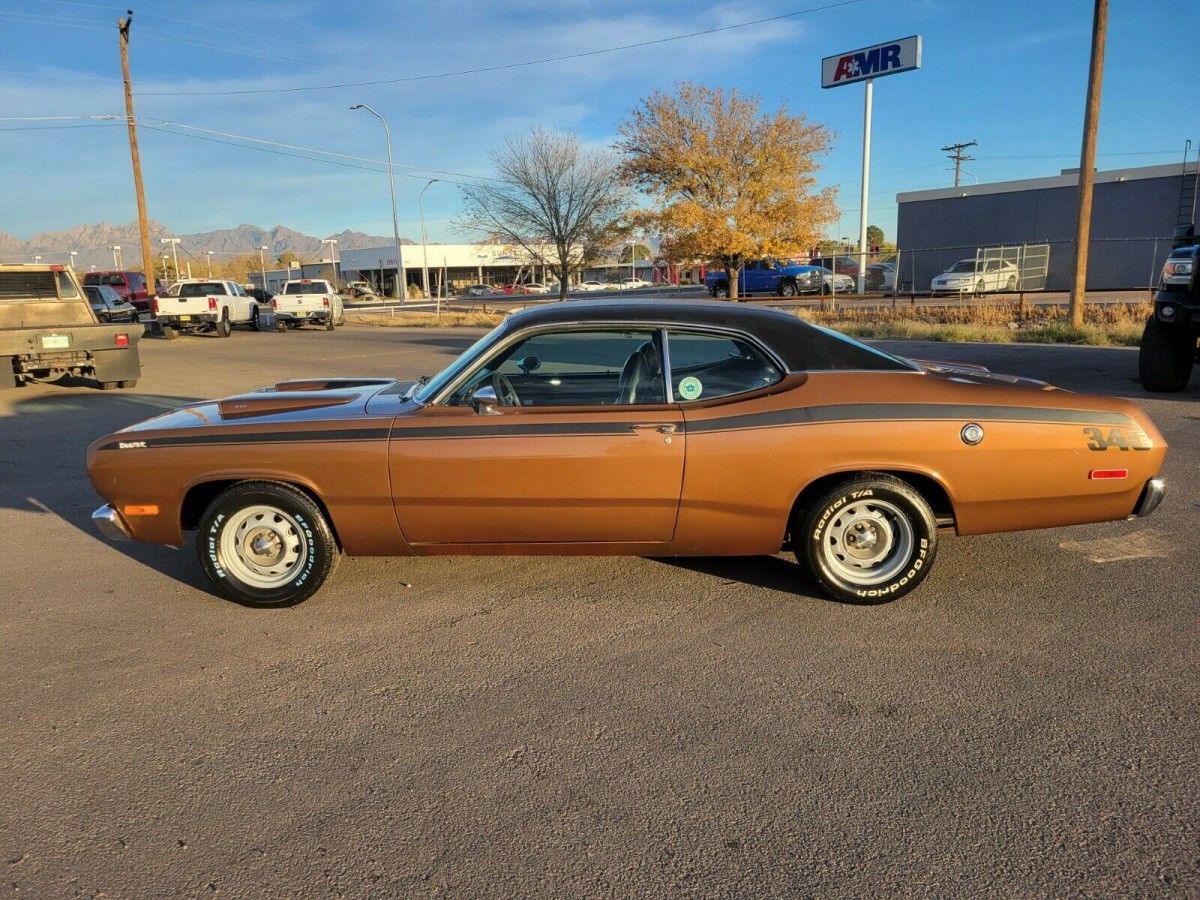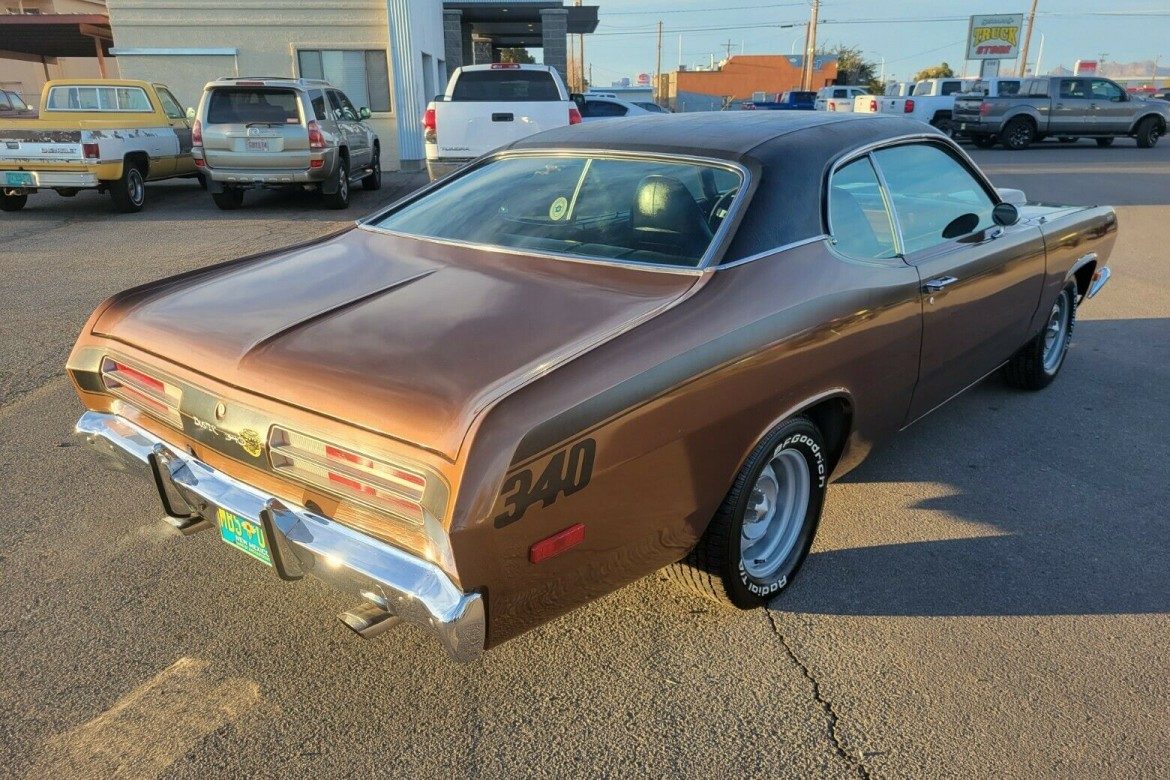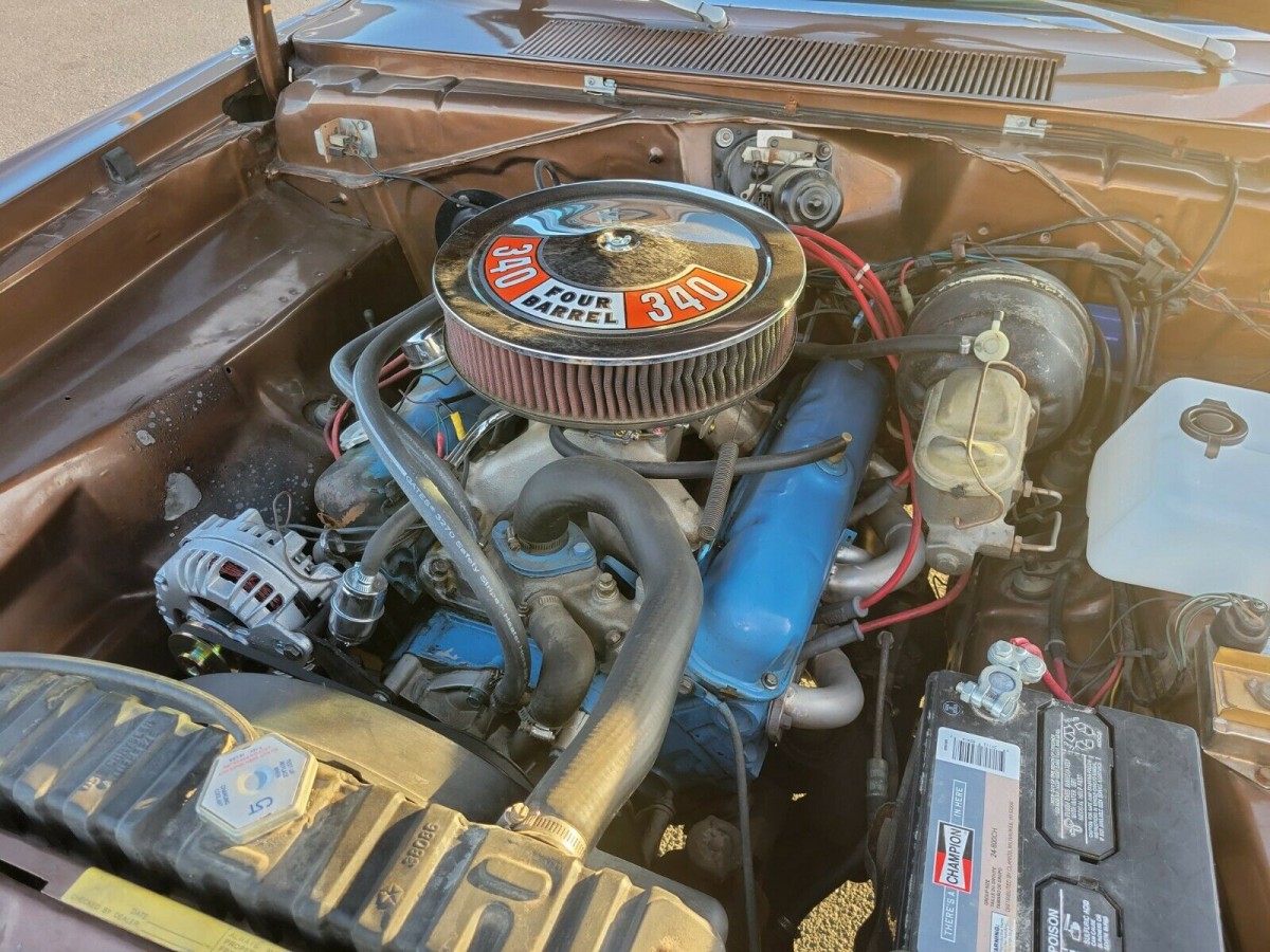 I love the color , but the brown has got to be rare for a 340 ; I dont think it was popular compared to the other colors available , which were around 16 that year. If the car is mostly unmolested , its a fairly high optioned 340. Auto/console and bucket seats, carpeting, Tuff wheel , light package option, wood grain door panels and dash trim , hood scoops , bumper guards, vinyl top, dual sport mirrors and the rare (for A bodies) factory AM/FM radio . If I was in a position to buy it the only thing I would change is the little nit picky things like a factory gas cap and put the original intake and air cleaner back on.