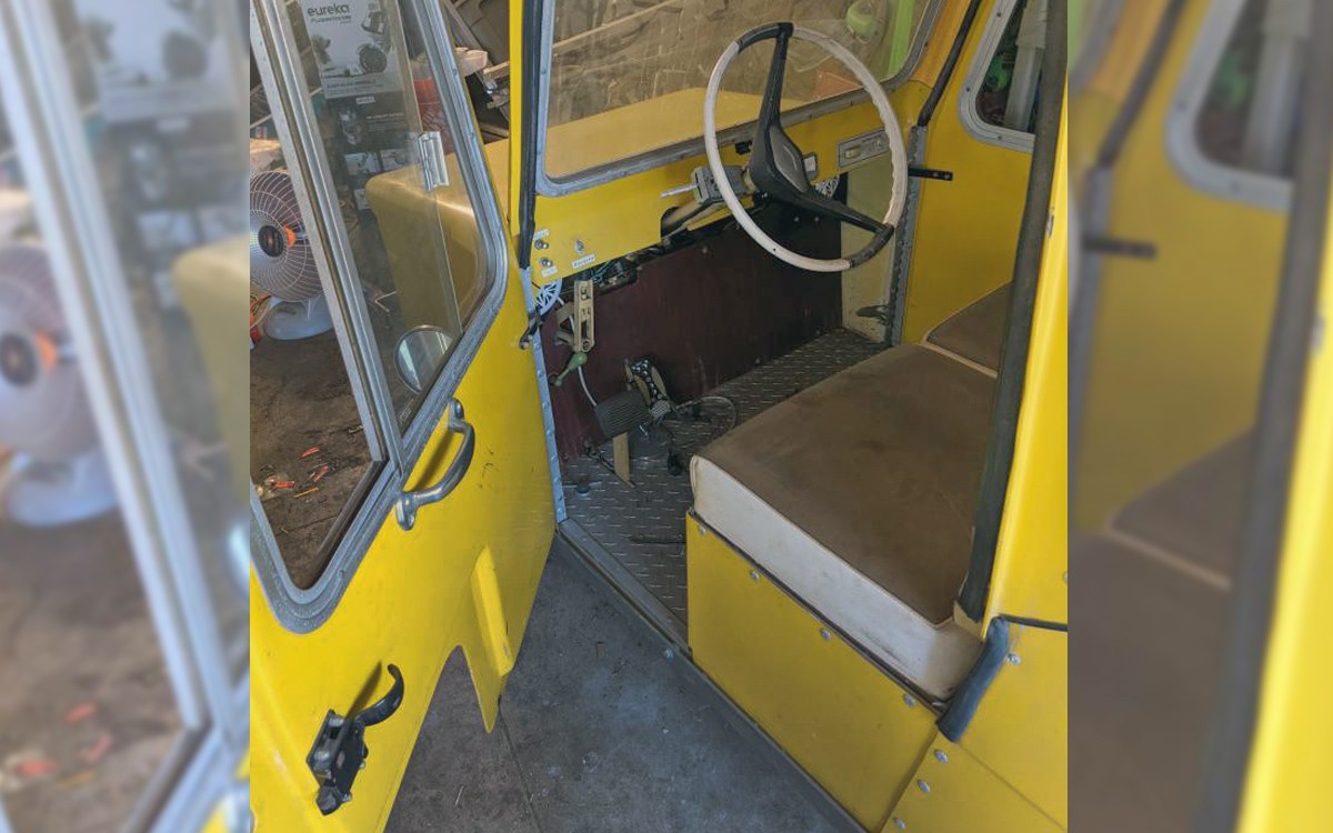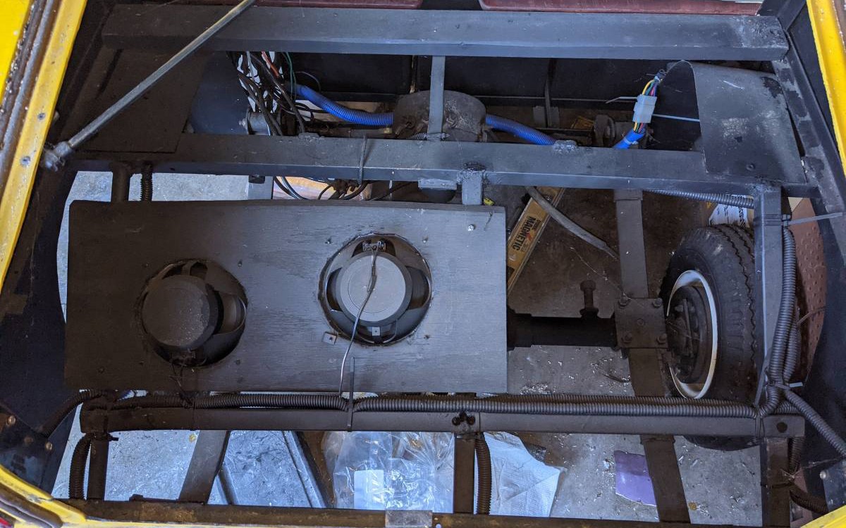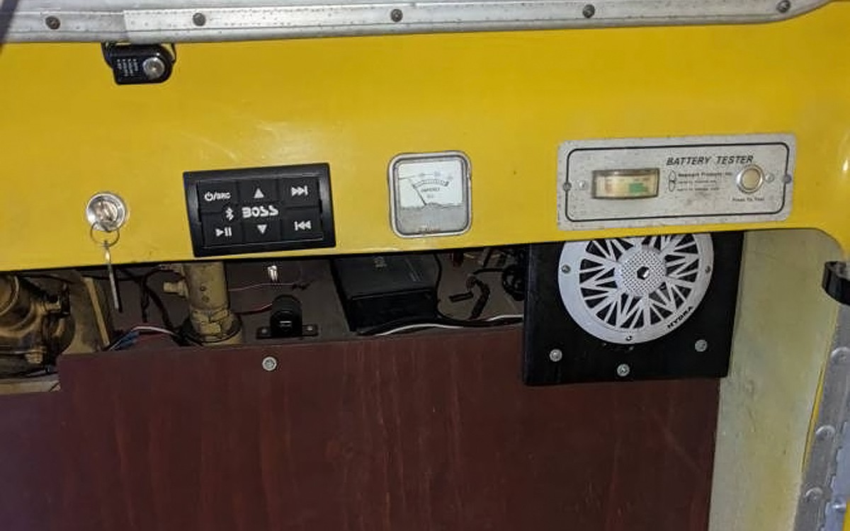 It looks like there are a couple of Hydra marine speakers under the dash and what looks like a Boss MC900B (just a guess) Bluetooth amp. That’s cool and it would help to drown out the whirring sound from the electric motor which is just behind the batteries under the seat. Seeing a 50-year-old electric car with a Bluetooth digital audio system is like seeing an Amish guy with Google glasses on, but it’s always handy to have hands-free chatting ability, even if you’re only going 25 mph.