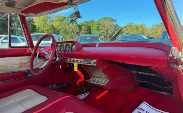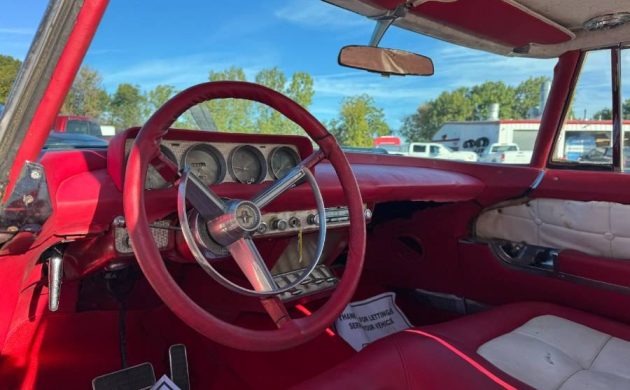 Although this Mark II is far from being ready for the concours showfield, it is a running car with a solid body, and that is about all we can glean from the advertisement regarding the condition of the car. An in-person inspection will be vital, although it may be a “what you see is what you get” situation. The engine itself is a 285-horsepower 368 Lincoln Y-Block, a very handsome engine with its Continental-specific ribbed valve covers. Also notice how the exhaust manifolds and pipes exit through the engine compartment, where they follow the frame rails to their terminus at the rear bumper, which was done in an effort to keep the Continental as low as possible. This car also has air conditioning, not exactly a common thing on a car in 1956, but when the buyer is forking over $10,000 new, one cannot be surprised.