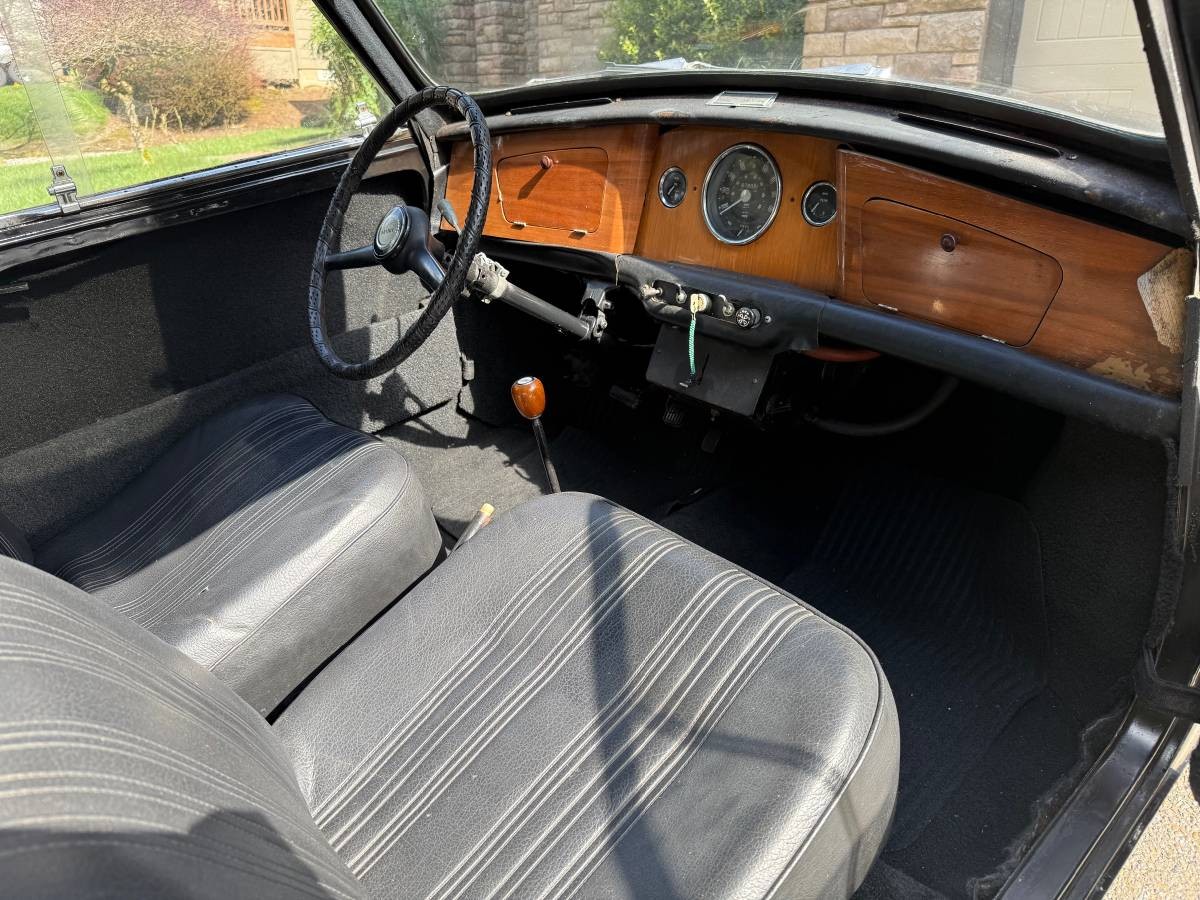 One aspect of this Cooper needing little work is the interior. The dash timber exhibits deterioration on the passenger side, although this is an isolated spot that might be repairable. The Black vinyl upholstered surfaces are free from major problems, and the carpet is clean. The gauges feature clear lenses and crisp markings, and the car retains what appears to be its correct timber shifter knob.