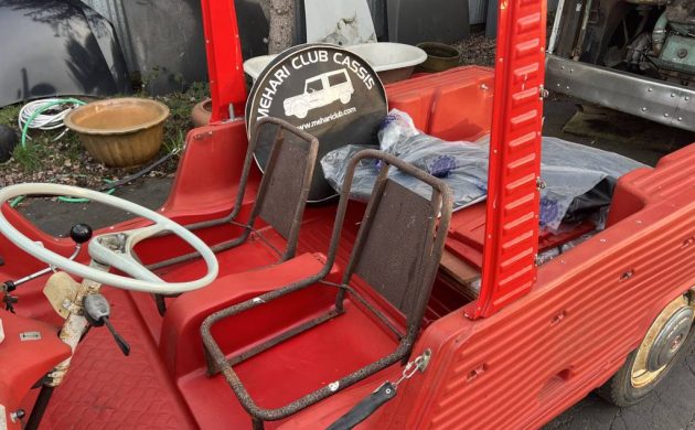 The Mehari sits on the same chassis as a Deux Chevaux – Citroën’s A-series car featuring four-wheel independent suspension. The engine is the 2CV6 “big block” 602 cc air-cooled flat twin, producing about 29 hp. The little engine is only responsible for propelling 1100 lbs, so top speed is around 70 mph – if you dare. A four-speed manual gearbox drives the front wheels; braking is via drums all around. The seller notes that the car ran when purchased, but after the installation of electronic ignition and a carburetor rebuild, it will not start. This Mehari is a two-wheel drive version; in 1979, a 4WD option was introduced with four-wheel disc brakes.
