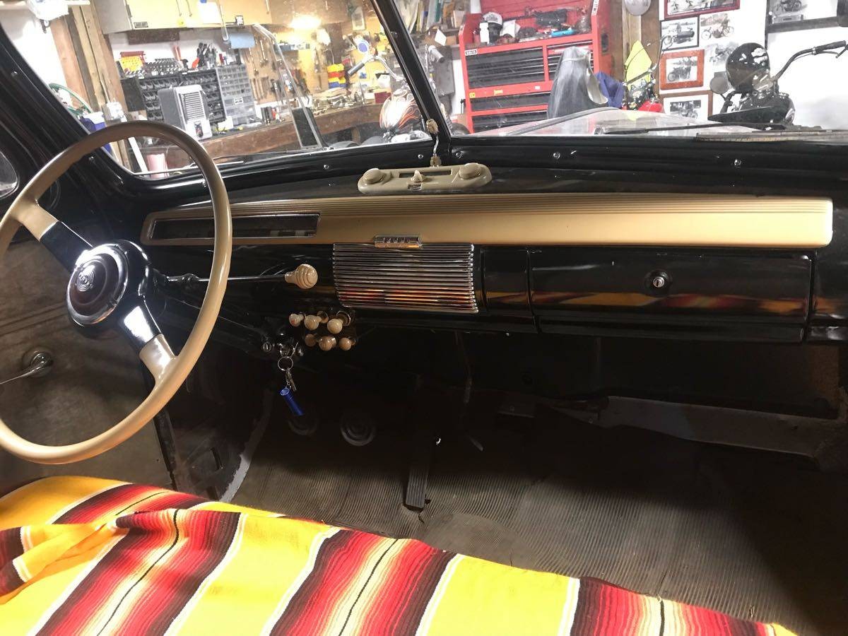 Looking inside, we see that the dash wears a brilliant coat of black paint, It is probably a repaint though. If the pans needed replacement, then the interior was probably humid enough to damage the finish to the point that stripping and repainting would be necessary. What likely is new is the ivory colored plastic trim on the dash and at least some of the dash knobs. The steering wheel also looks to have been the recipient of some restoration. The rubber mat on the floor has the appearance of being original though. The seller tells us that the interior will need to be re-upholstered, but a new headliner with steel ribs will be included in the sale.