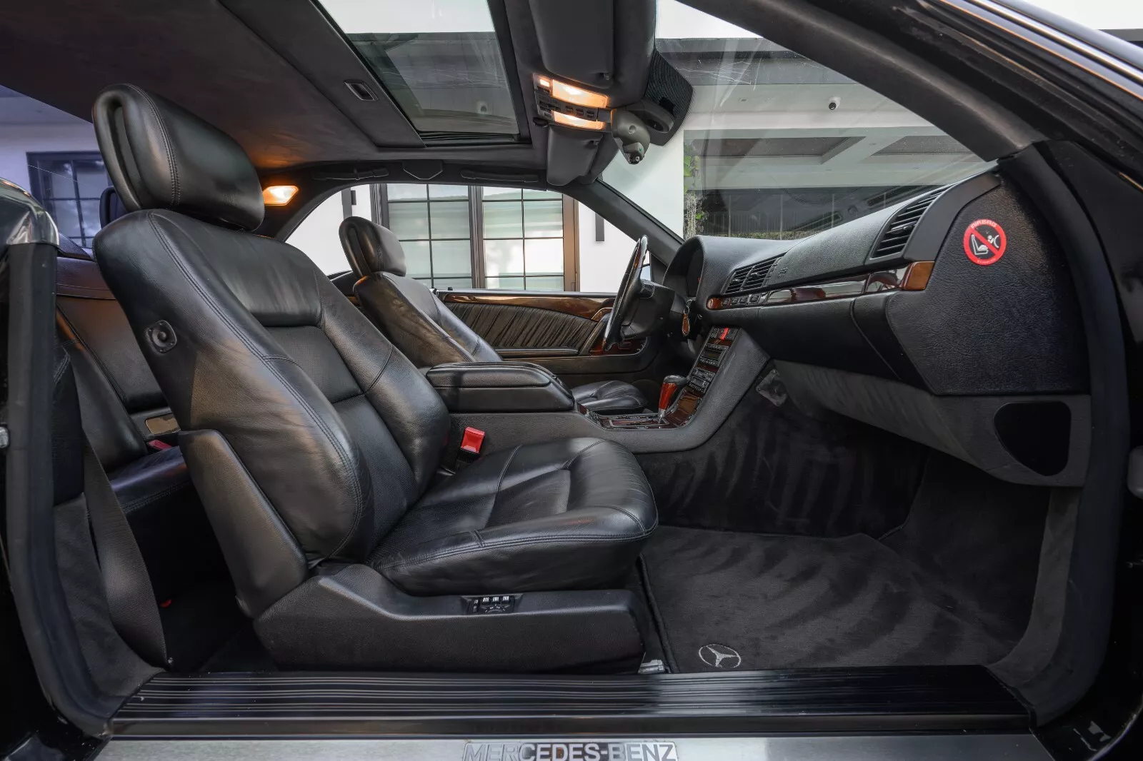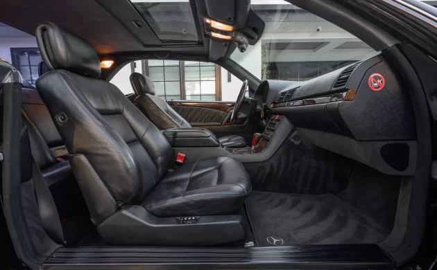 The car we intended to feature was very similar with one big distinction: this is a European-market example, which came with bumpers that sit closer to the body and turn signals mounted in the fenders. There might be a slight performance boost as well due to less restrictive emissions equipment, but that may have been less of a factor in late-model imports. In this photo, you see one of my favorite features of a big body Mercedes coupe: the pillarless design with no B-pillar present. Put the windows down and you can see clearly from side to side. The seller’s car comes with a set of color-matched factory wheels, which look slick against the black paint.