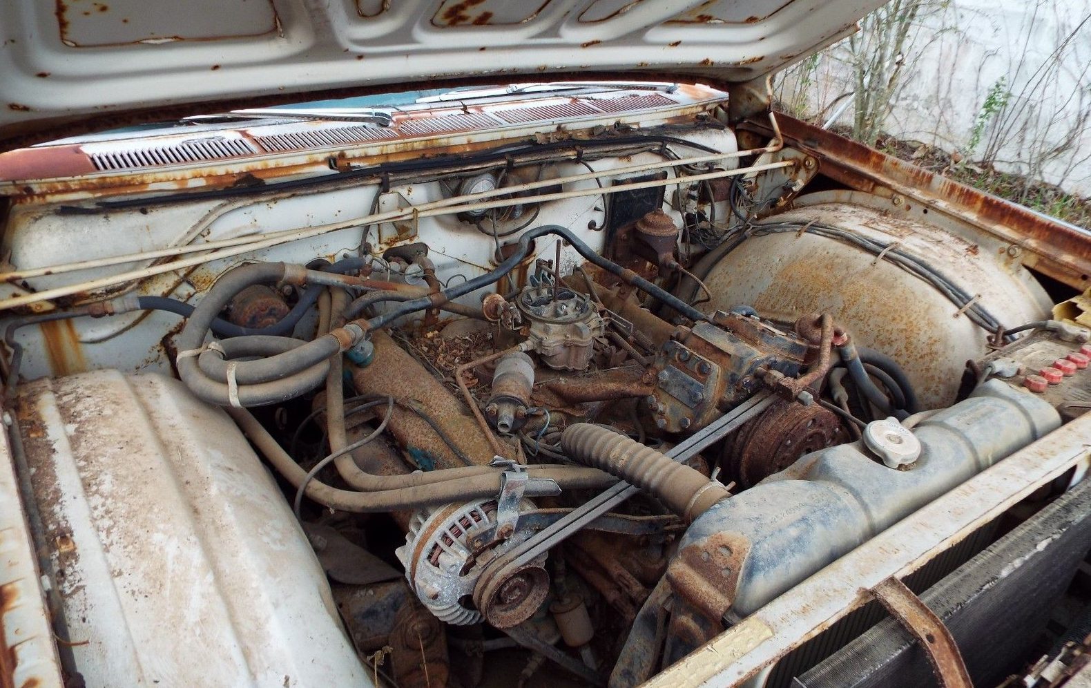 The interior has held up well enough for a car presumably in storage for many years. The seats will need to be re-upholstered and the carpets (or what’s left of them) need replacement. Mopars of this era always had such stunning dashboards and this one is no different; fortunately, it appears most of the switchgear is still present and the dash isn’t too badly damaged. Some trim is missing from the door panels but it looks like the jambs are free of major corrosion.