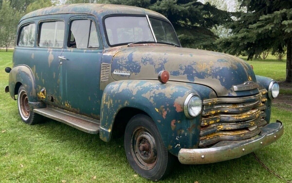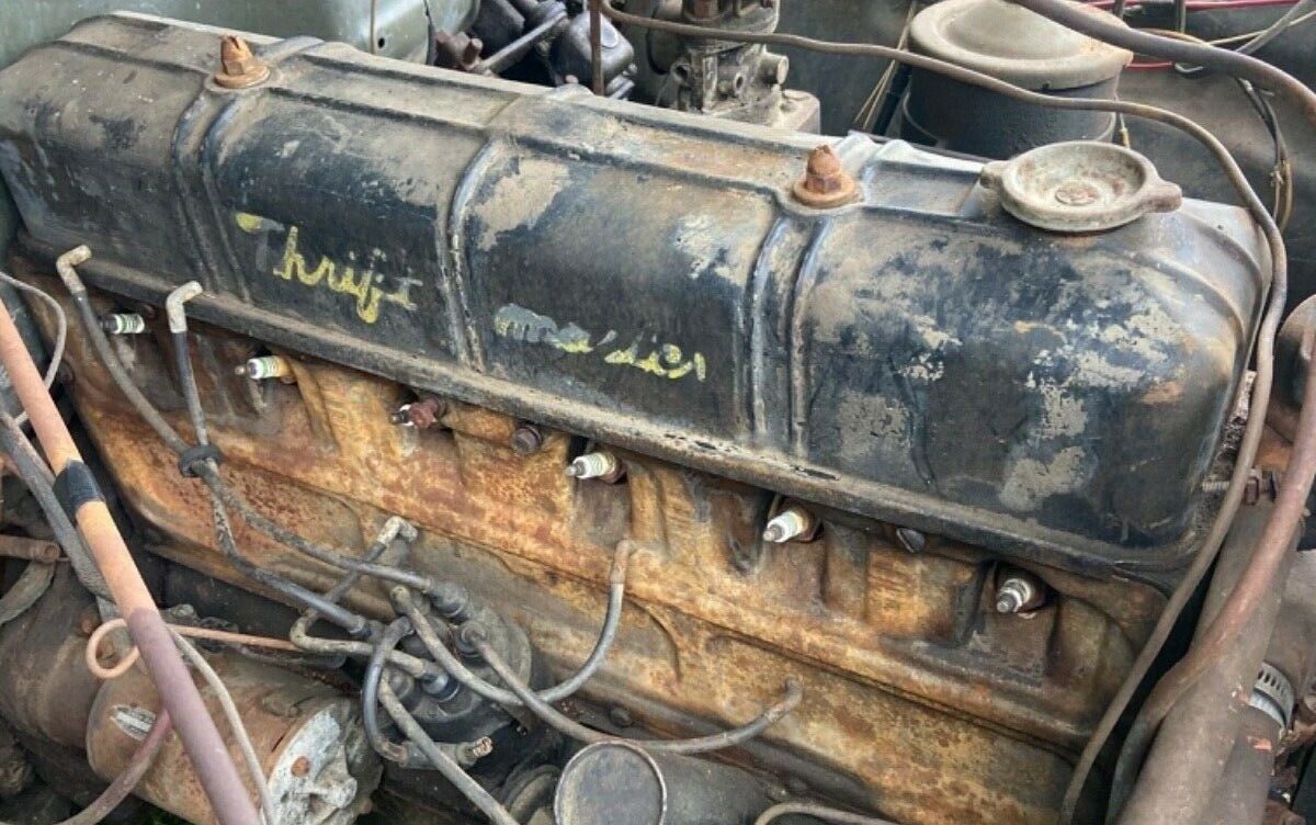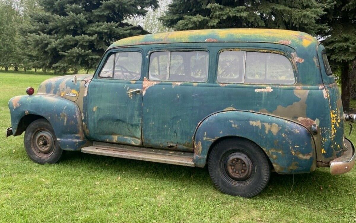 Unlike the modern Suburban, this 1951 example is powered by a 235 cubic inch (3.8 liter) Thriftmaster inline-six driving the rear wheels through a manual gearbox. The information I found about the third generation ‘Burban says that the Thriftmaster was available only starting in 1954, and could be had with a three-, or four-speed manual or a four-speed Hydramatic automatic transmission. Regardless, the valve cover clearly says Thriftmaster, and I spot a clutch pedal on the floor. The seller states that the engine doesn’t run, but it can roll and the transmission shifts through how ever many gears it does have.