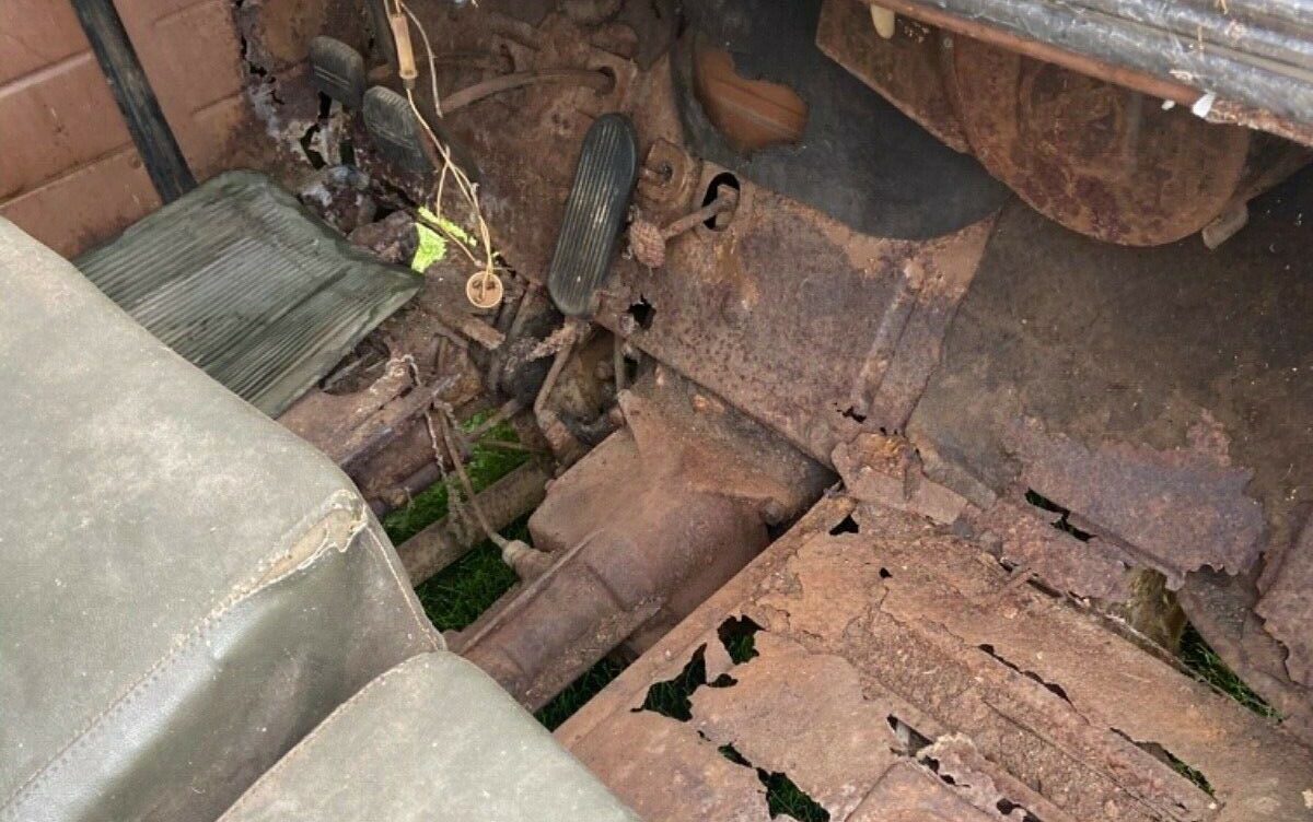 Inside, you’ll find a split front bench and enough room in the back for half a dozen or so more passengers, but no seats for them to sit in. This truck was a former government work vehicle, so form always follows function. In a work vehicle, seating for eight people isn’t as often needed as cargo room. The floor is rusted through in the front footwell, and that split front seat will need new upholstery, but as far as projects go, this seems to be relatively complete and uniquely situated for someone’s dream rat rod build.