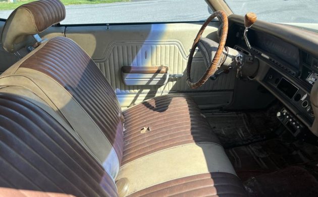 Beige paint, black hood, brown vinyl “landau” roof, and brown and tan pleated vinyl upholstery. Whoever built this really needed someone to help him evaluate his color and fabric choices.