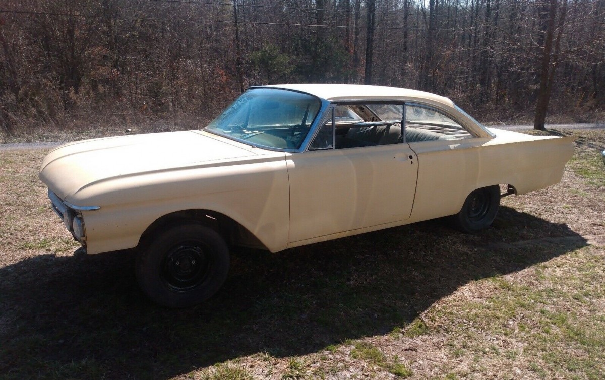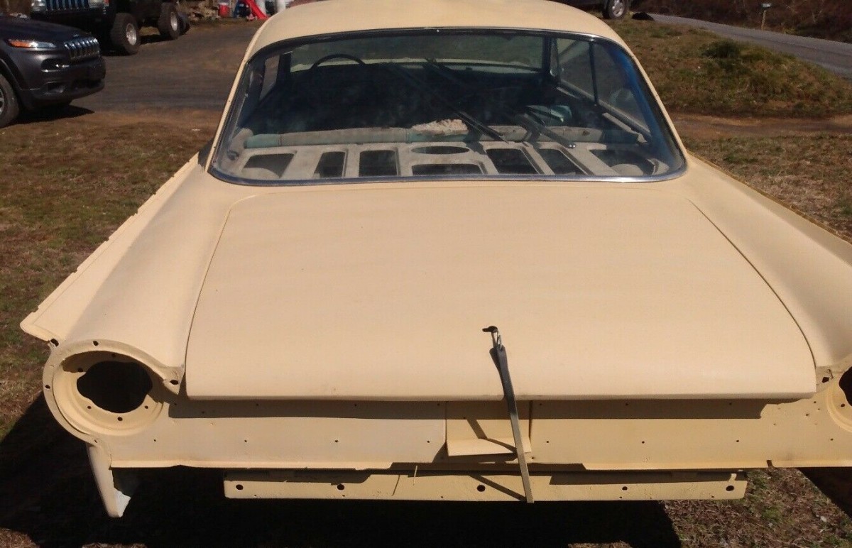 We assume this 1961 Starliner became someone’s pet project that stalled out once most or all of the body work was done. The original finish is said to have been white, but it seems to wear some sort of ivory-colored primer now. If there was any rust, presumably it has been eradicated, but there are no photos of the undercarriage, inside the trunk or under the hood to confirm that assumption. The seller says he has a lot of the chrome pieces and they appear to be inside the car, but that collection may not be complete. And what about the bumpers? Could they be in the trunk?