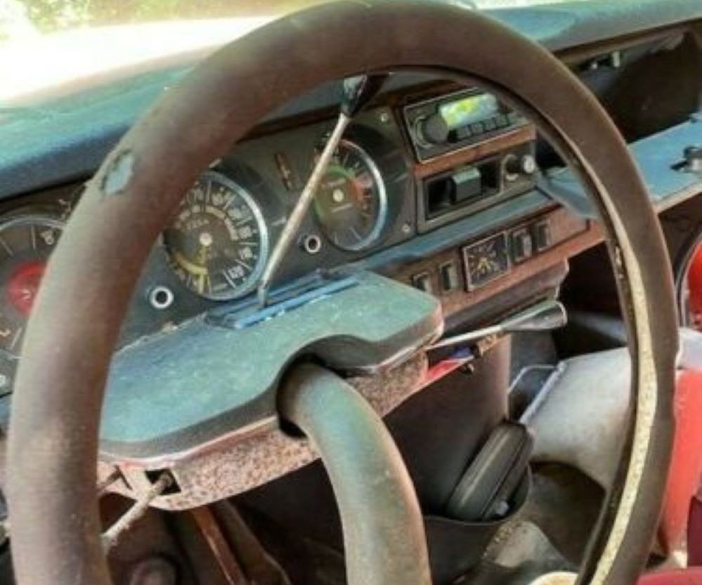 The seller states that this is a 23K mile example and that’s what the odometer (and I’ll go with the assumption that the speedo and odo are in miles and not kilometers) reads. But is the mileage 23K or 123K? just sayin’. There are no comprehensive images of the interior included, but rust abounds on all of the visible metals surfaces. This example would seem to have been parked in damp conditions with the windows down. The seller claims that the dash and seats are descent though the headliner has become earthbound. What can be seen of the seat upholstery appears to be a maroon shade of a velour type of fabric but there are no complete images included. The seller adds that the floors are solid – after gauging the interior, I’d want to see for myself. The steering wheel in this Citroen is an interesting piece, it looks like the tiller on the Leakin’ Lena’.