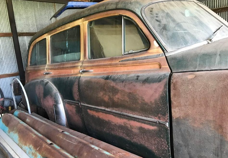 Hatch doors seem to be operating with decent looking latches and supports. The side trims are missing on the front fenders and though many 1952 Tin Woodies have lobster-eye taillights at the side/rear haunches of the car, there are none here and no evidence of holes. The exterior patina of this ’52 is even and maybe a good candidate for slammed and patinaed finished stylings. The five-tooth bumper with its turn signal lamps is seen in here as well as some pretty impressive-sized boxes of who-knows-what but likely Tin Woodie components.