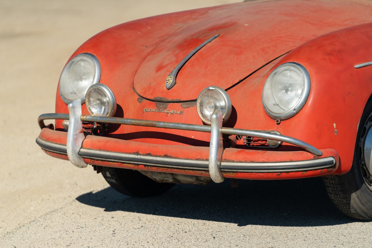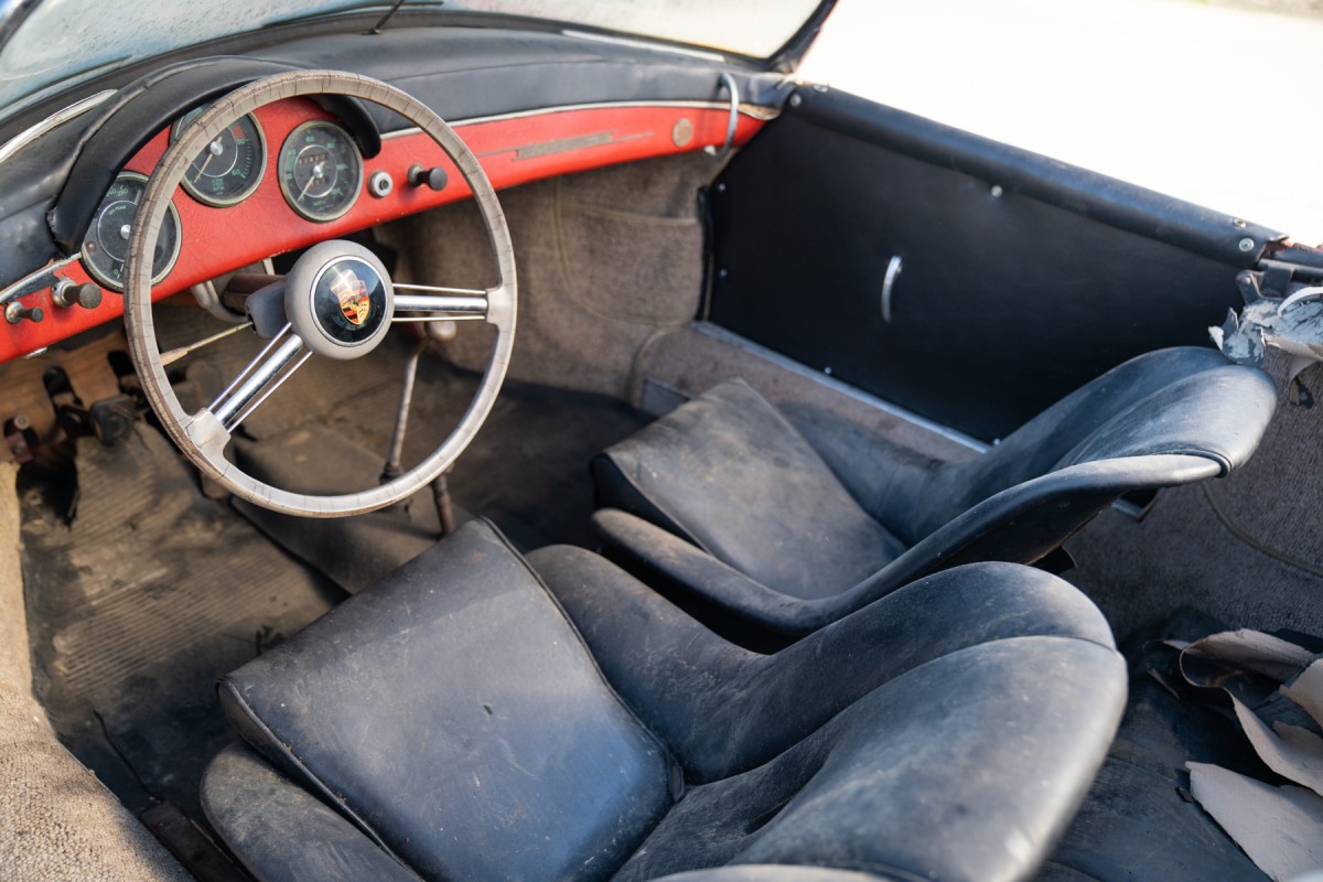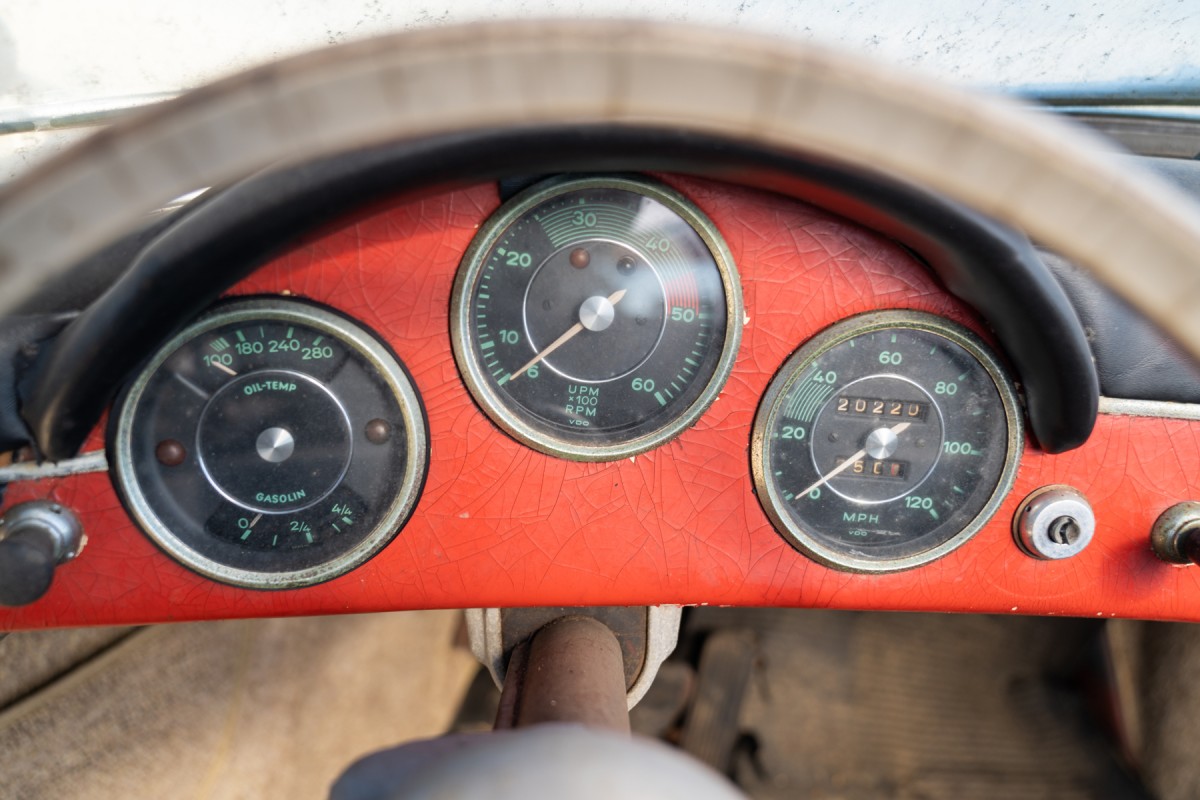 The iconic Speedster bucket seats are still present, and these seats alone are a hugely valuable feature of an original 356 Speedster. The floors don’t look bad here, but obviously, an in-person inspection is warranted, especially given how much this Speedster is likely to hammer home for. Photos show that the soft top is in tatters but the original frame appears to be in good shape and it’s said to come with its original side screens and some assorted spares. The car was originally painted white, but at some point, it was treated to a full-color change. It appears to have been a quality job though, as it’s held up well over the decades and there aren’t any obvious signs of overspray. It’s nice to see that the car still retains its original steering wheel and doesn’t show any signs of go-fast modifications.