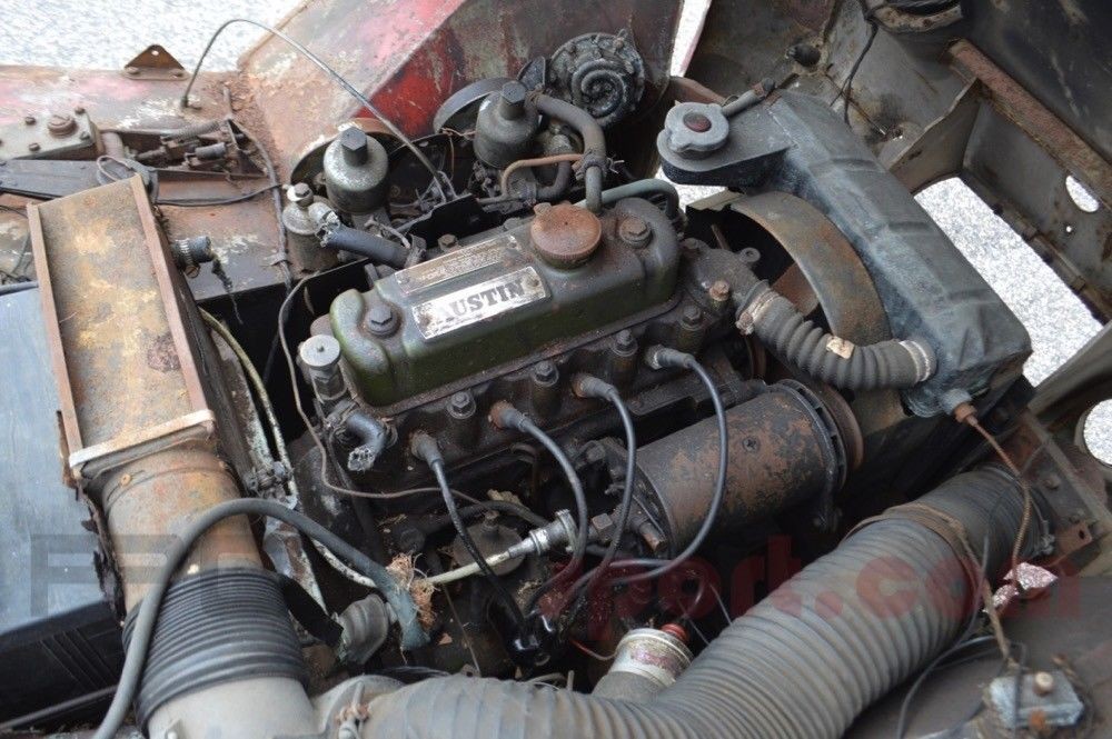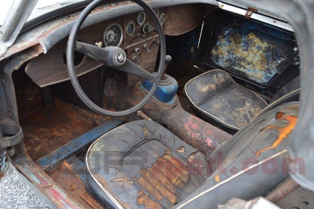 The good news is it appears relatively complete, even if the cosmetics are quite rough. Good glass, a fair amount of trim, and relatively straight panels all make this one appealing as a parts car if nothing else. The soft top appears to be a lost cause, but that’s not entirely surprising. Four good hubcaps will also accompany this long-stored Bugeye.