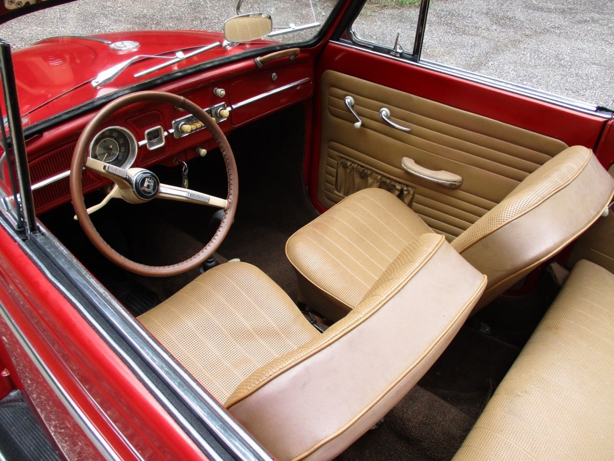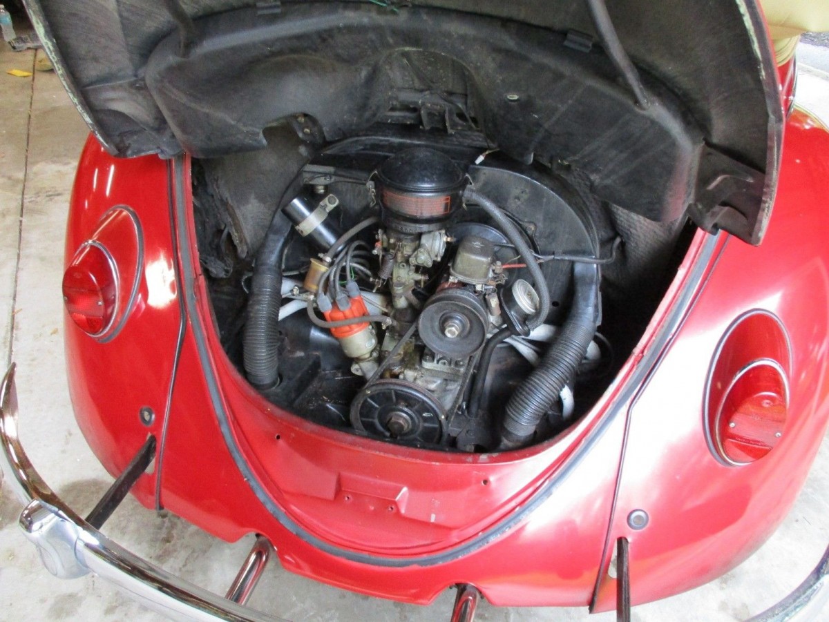 Here’s the classic boxer 4 engine. At just 1200cc this little engine only processes about 34 horsepower, but it’s enough to get a lightweight Bug down the road. If you are going to daily drive one, you really want it to stand out so that other motorists don’t run you over! This one’s bright red paint job should do the trick on that front.