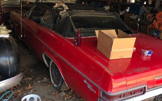 The seller of this ’66 convertible has it listed as an SS model, it’s not. The VIN has not been provided, but the lack of bucket seats/center console is a dead giveaway that is further reinforced by the non-SS Impala fender badge and the erroneous Super Sport emblem, hiked from a ’67 Chevelle SS396, affixed to the quarter panel. The few included images are poorly positioned so it’s difficult to get a comprehensive look at the entire car. From what can be seen, however, the body of this Impala is straight and it appears to be rot free – again, hard to know based on the images and the lack of listing details. The seller states, “solid car, needs cosmetics“. One thing that a prospective buyer will want to check is the condition of the floors and the under-rear-seat panel. These vintage convertibles were notorious for water intrusion around the fitment of the convertible top, I know from experience with both a ’66 and ’68, and the collected water will work its worst. And speaking of convertible tops, the one on this car will need to be replaced – an easy part to source but a tedious replacement process. The red finish, however, still presents pretty well.