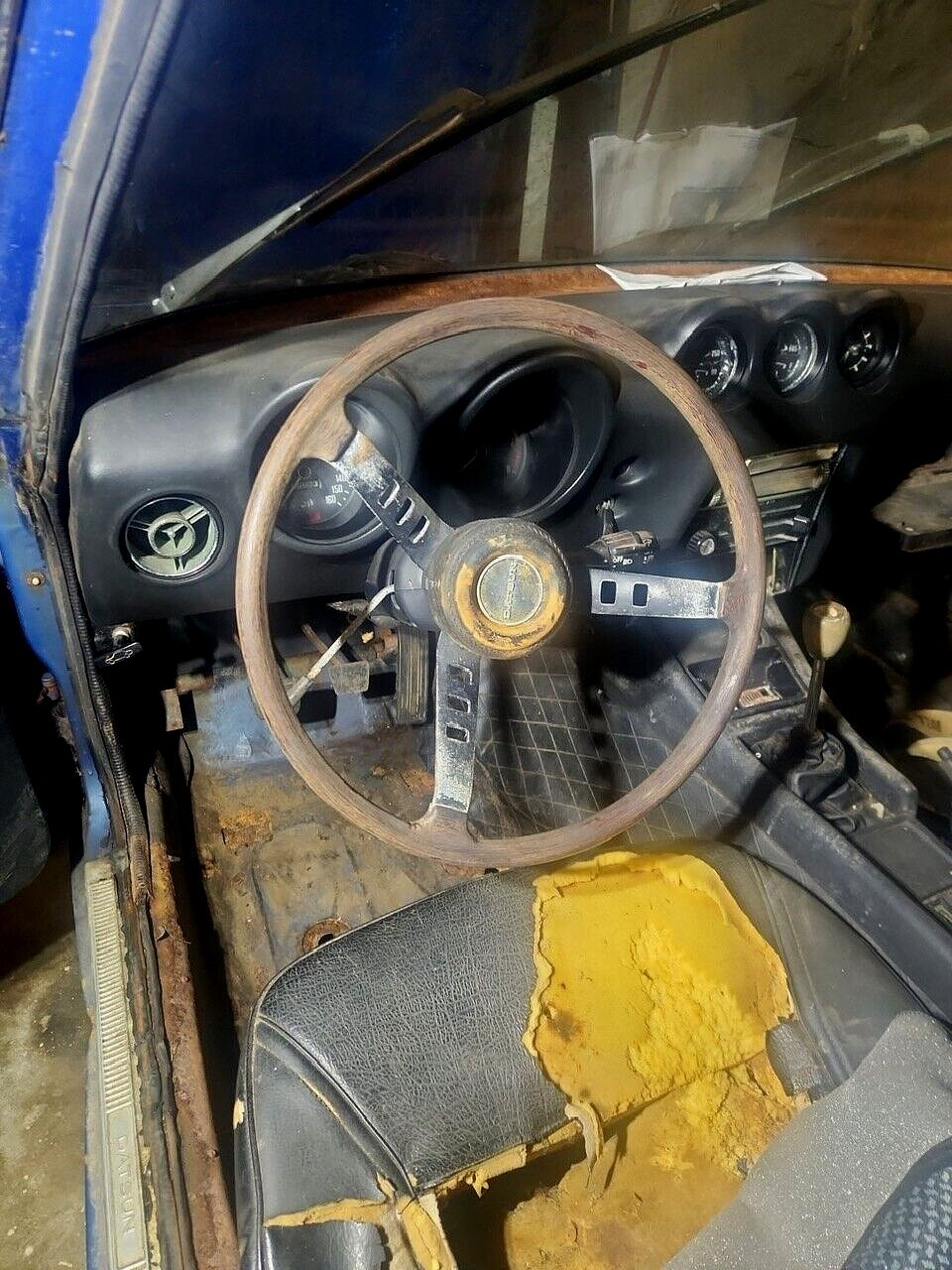 This interior is rough and shows wear, fading and many broken items. The carpet was removed to show the floorboards which show floorboards. The seller needs to add videos and more pictures. The car looks pretty crusty and will require a personal inspection to see the undercarriage. I remember looking at a Datsun 240Z when I was in college. It was white with a black interior. When the seller started it up, it sprung a gas leak with the hood up that look like a geyser!. I figured on my limited budget that this was not the car for me at the time. However, I have always admired the looks and design on the Z car. The body is said to be very straight by the seller with all the glass intact.