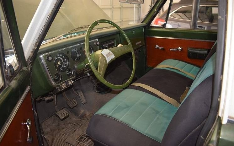 Inside, we find a lot of green, blue and woodgrain going on. I’m not sure if the seats are actually blue or a faded green but I’m pretty sure they are covered in a blue replacement fabric. The rest of the interior looks like how you would expect a circa 1971 pickup truck to look, utilitarian. It does appear to be sound though.