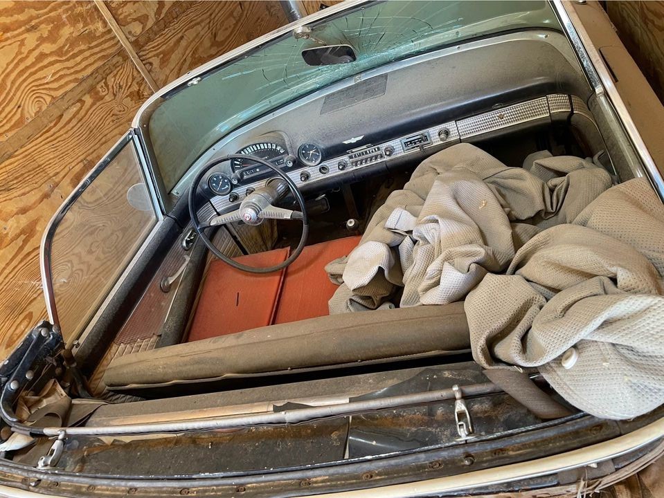 The seller’s ’55 model is a project car that looks to have been sitting for a long time. Because the T-Bird is featured in a tight space, we can’t gauge the condition of the body except that it’s very dirty. We’re told that everything is there, but we don’t see a hood. Instead, we see several boxes piled on top of the engine, which is probably the 292 cubic inch Y-block V8 that came from Ford’s Mercury division. The seller says it has an automatic transmission, which would be the Ford-O-Matic 3-speed.