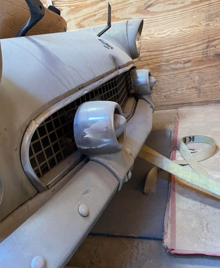 Colors on the Ford are said to be grey on the outside and tan on the inside, but it could very well be white and black/red. The windshield appears to have several thin cracks in it. The car saw relatively little use before it went into hibernation, with an odometer reading of 62,000 miles. This one is the convertible edition, and we assume the canvas material has long since given up the ghost. Although the car is in Nevada, it has a California registration with vintage black license plates.