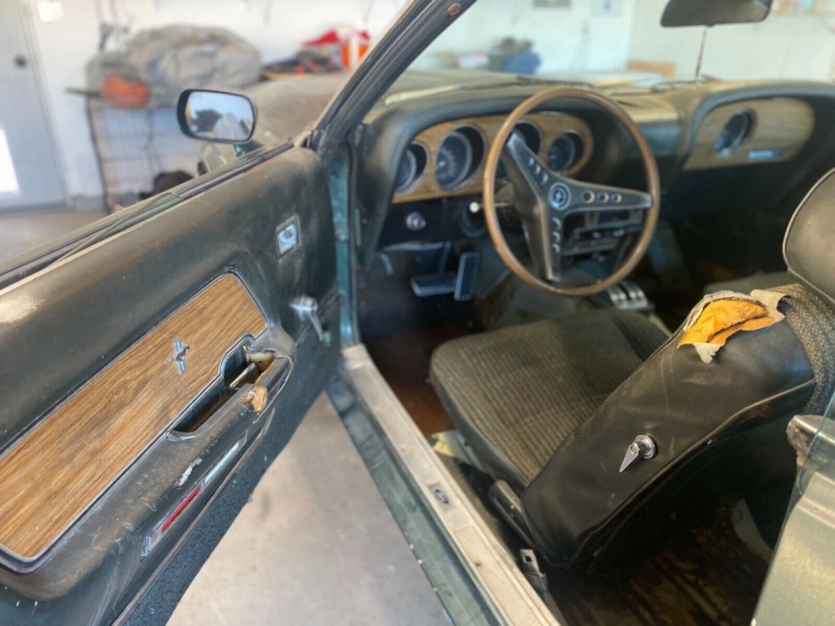 Out of some 300,000 Mustangs built for 1969, 22,182 were of the Grande flavor. With a starting price of $2,849, the Grande was $231 more than a standard Mustang coupe to start with. The extra bucks got rich-looking (but fake) wood appliques on door panels, instrument panel and the glove box. Bucket seats were vinyl with hopsack cloth inserts. There were also door panel courtesy lights and bright pedal pads. To this, you could add an optional vinyl hardtop roof in either black or parchment, having a leather-like appearance. Wire-spoke wheel covers (which the seller’s car no longer has) added to the luxury angle and there were two-tone narrow paint stripes and racing-style side mirrors on the sides.