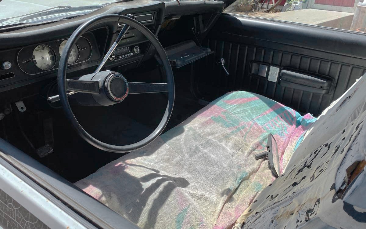 You can see the faded and cracked formerly-black stripe on the driver’s door looks like it’s been in a desert environment for ohhhhh, around 49 years, give or take. And, the front seats must have seen better days, but the back seat looks great. Dirty, but great. Is the top of the dash a bit wavy or are my eyes wavy? The seller says that this Gremlin is an original California car, it has always been parked in a garage, and has been sitting since 2007. You can see the three-speed manual column shifter. I love to see that.