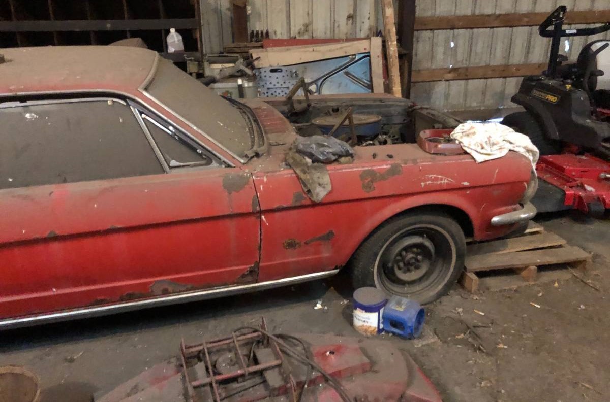 We don’t see the whole Ford in any one photo and the garage is dark, but the seller has detailed what he must sell. Most of the pictures have writing on them to describe what parts there are. The Mustang could be wearing its original red paint and the interior pieces are red and black. While no dents jump out at you, there is a lot of rust in the door and fender on the passenger side. We don’t know about the driver’s side and part of the car is covered up with stuff.