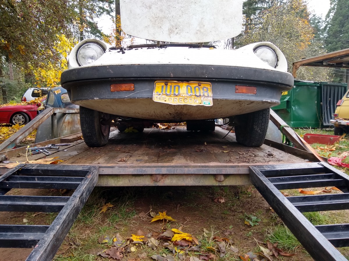 Not sure if this comment will post from my phone – I’m the owner of this car. I picked it up completely buried in dirt with no suspension at all. It was due to be scrapped with the rest of the parts on the lot – transmissions, motors, Porsche parts, body panels, engine tin. The lot. I couldn’t let that happen to such a hard to find car. I put the beam and trans in it just to make it a roller, I’m not even sure if they were originally wide five. The beam is bent however the trans just needs rebuilt, it was outside a very long time on the same property. As for the wheels not being included, they’re simply not mine, and thus not mine to sell. I’m borrowing them from a friend so it can get on and off the trailer easier than when we loaded it up (we used 3 hand dollies, a lot of tow straps, and 4 people to load it, along with some logs to make it roll on the pan. What a pain in the butt!) If you’d like more photos or info about the car please feel free to contact me through the facebook ad or through here I guess. I just want the car saved, I’m not in it for the cash, just to make what I can back from it. According to the plates it was last registered when it was 6 years new – ’86 is the last tag on an Oregon plate. The carpet and interior details are still there, such as the tunnel cover, seatbelts, the dash which is in surprisingly good shape. There’s a lot of good in the car. I know it can be brought back by someone who really wants one. Thank you for writing about my car, even if the article is a little on the downer side.
