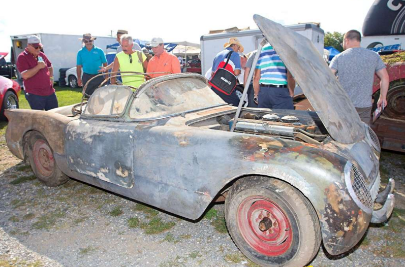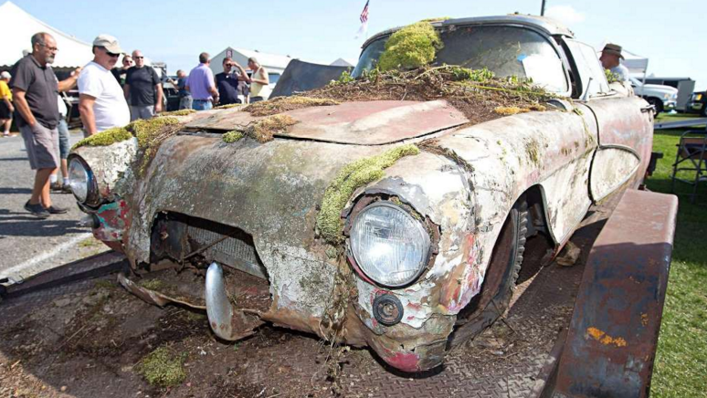 Both cars were taken to the show for the purpose of display, and the owner quickly found his weathered C1 Corvettes were the star of the show. His wife even “watered” the moss growing on the ’56 car to ensure it looked as lush as it did when first removed! The hood wasn’t even opened to see what motor was inside for fear of disturbing the years’ of accumulated moss. Both cars did sell at the show, with the ’56 earning $10K and the ’54 in the mid $20s. The Venetian Red / Polo White ’56 car was parked in 1972 and didn’t move again until last August when the owner was persuaded to sell it as part of a three-car deal.
