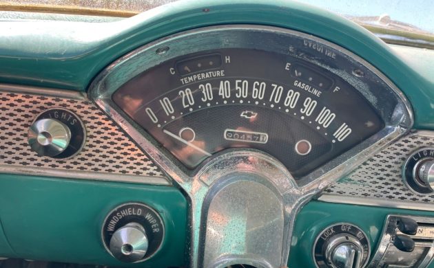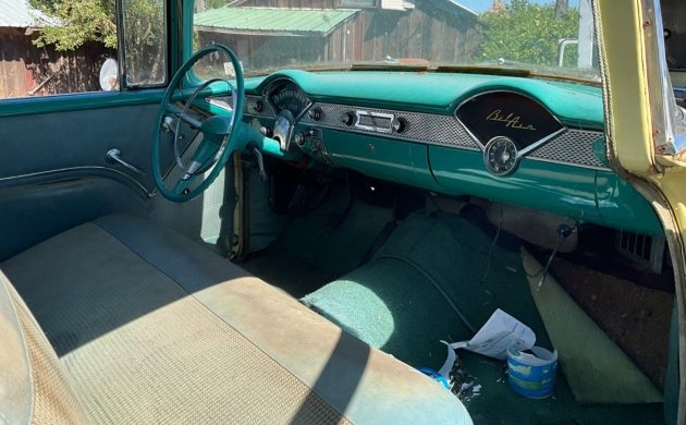 The car retains its original ivory roof paint, which has cracked with age, while the faded yellow body paint could potentially be buffed out if a preservation-style finish is preferred. Despite its age, the seller emphasizes that the car shows no significant rust damage, which is unusual for Tri-Five Chevys and makes this project especially appealing.