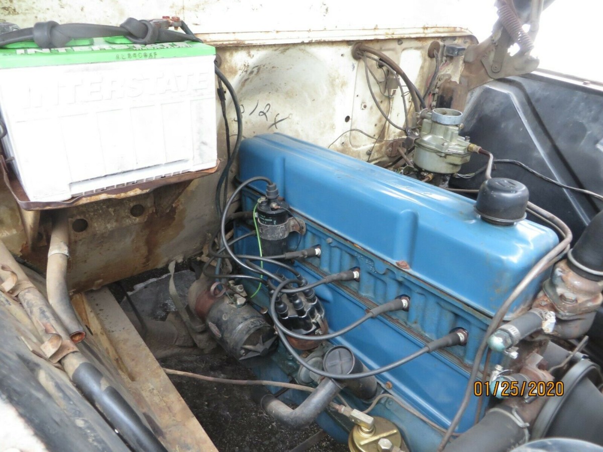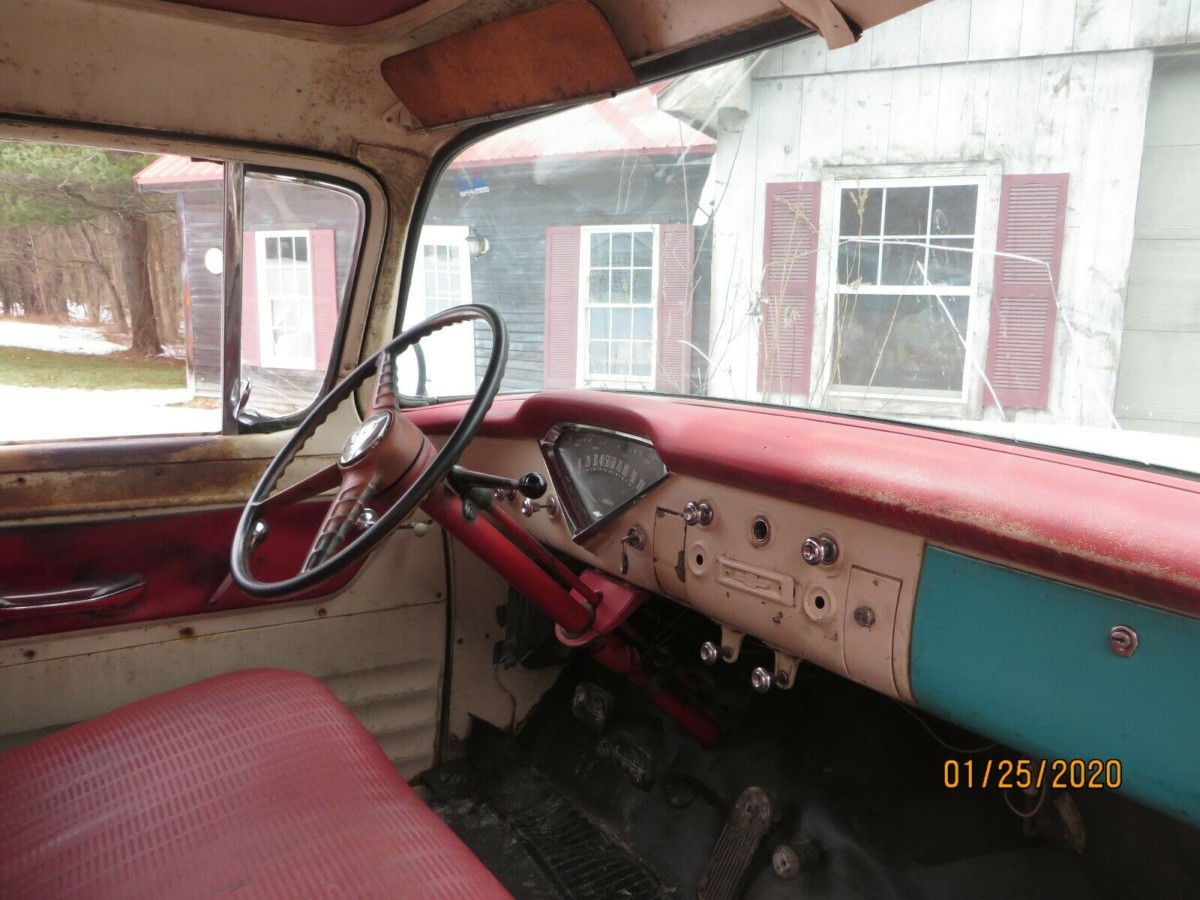 The two-tone look carried over to the interior, and Cameos were quite luxurious by truck standards of the day: dual sun visors, chrome knobs, armrests, cigarette lighter, and of course, the big rear window were all standard features. The trucks were also pricier than its less-loaded counterparts, and Chevy moved just over 5,000 Cameos in 1955. The interior of thus truck appears to be in fair condition, with the arm rests and sun visors still installed. The glove box door doesn’t appear to be original, but that should be an easy fix. The front windshield is cracked and will need replacing.